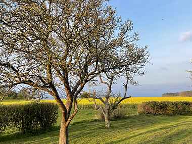 Fra udestuen og haven er der direkte udsigt over havet. Haven giver god plads til leg og boldspil – perfekt til aktive dage med familien.