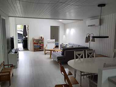 Den store vinkelstue og det åbne køkken giver plads til samvær. Her kan man lave mad, spille spil og nyde måltiderne sammen, mens lyset strømmer ind gennem vinduerne.