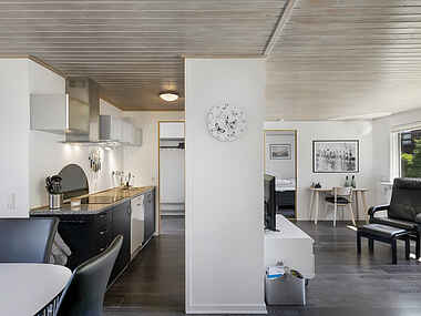 Køkken: El-komfur, køle-frys, mikroovn, brødrister, kaffemaskine, opvaskemaskine.