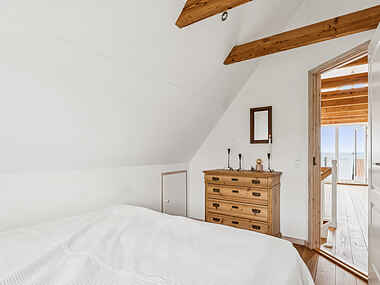 Inde finder du en nyere varmepumpe og en helt ny brændeovn, der sikrer behagelig temperatur året rundt. Køkken og stue er samlet i ét åbent rum med direkte adgang til terrassen, hvor havudsigten trækker blikket mod horisonten. Boligen har et lyst og funktionelt udtryk, der giver ro til ferien.