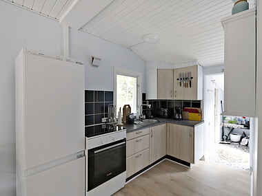 Der er et hyggeligt soveværelse med dobbeltseng til de vokse og i børneværelse er der plads til to i en køjeseng. Derudover har sommerhuset to sammenhængende stuer, hvor den ene er en afslappet opholdsstue med sofa og et 55-tommers SmartTV. Den anden stue er en spisestue med direkte udgang til den nybyggede træterrasse. På terrassen er der havemøbler, solsenge, en udendørs pejs, gasgrill, kulgrill og et udekøkken, der tilsammen indbyder til lange hyggelige aftener.