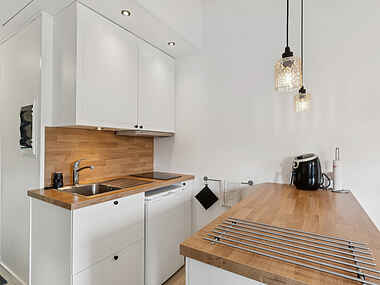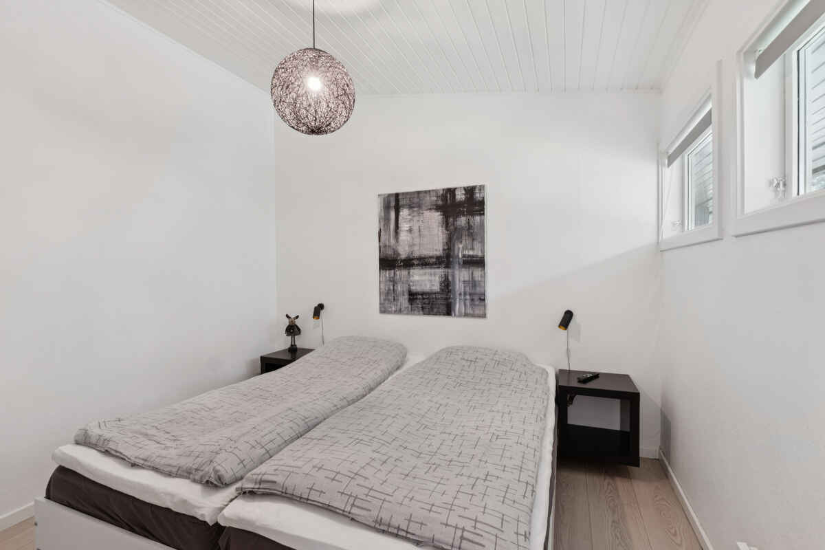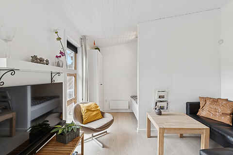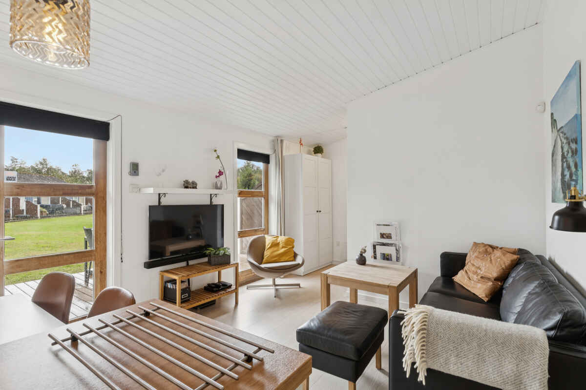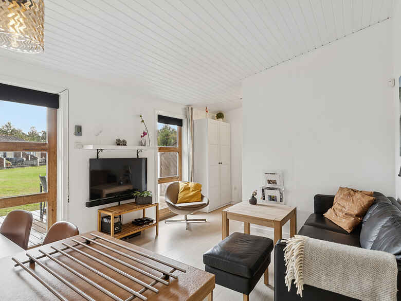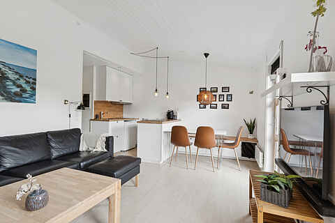 Boligen er 42 m² og har plads til fire personer. Den rummer et soveværelse med dobbeltseng samt en dobbeltopredning i alkoven i stuen. Indretningen er lys og moderne, og stuen har direkte udgang til en møbleret terrasse med grill.