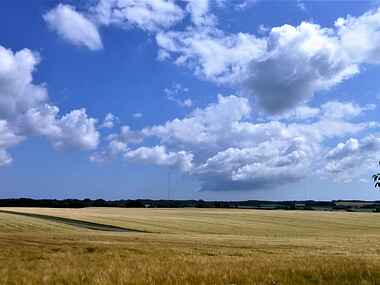 Den store terrasse ved gårdspladsen indbyder til fælles måltider og grillaftener med udsigt over åbne marker. Huset ligger eleveret og byder på smukke solopgange, solnedgange og et gyldent landskab, der understreger stedets fredfyldte stemning.