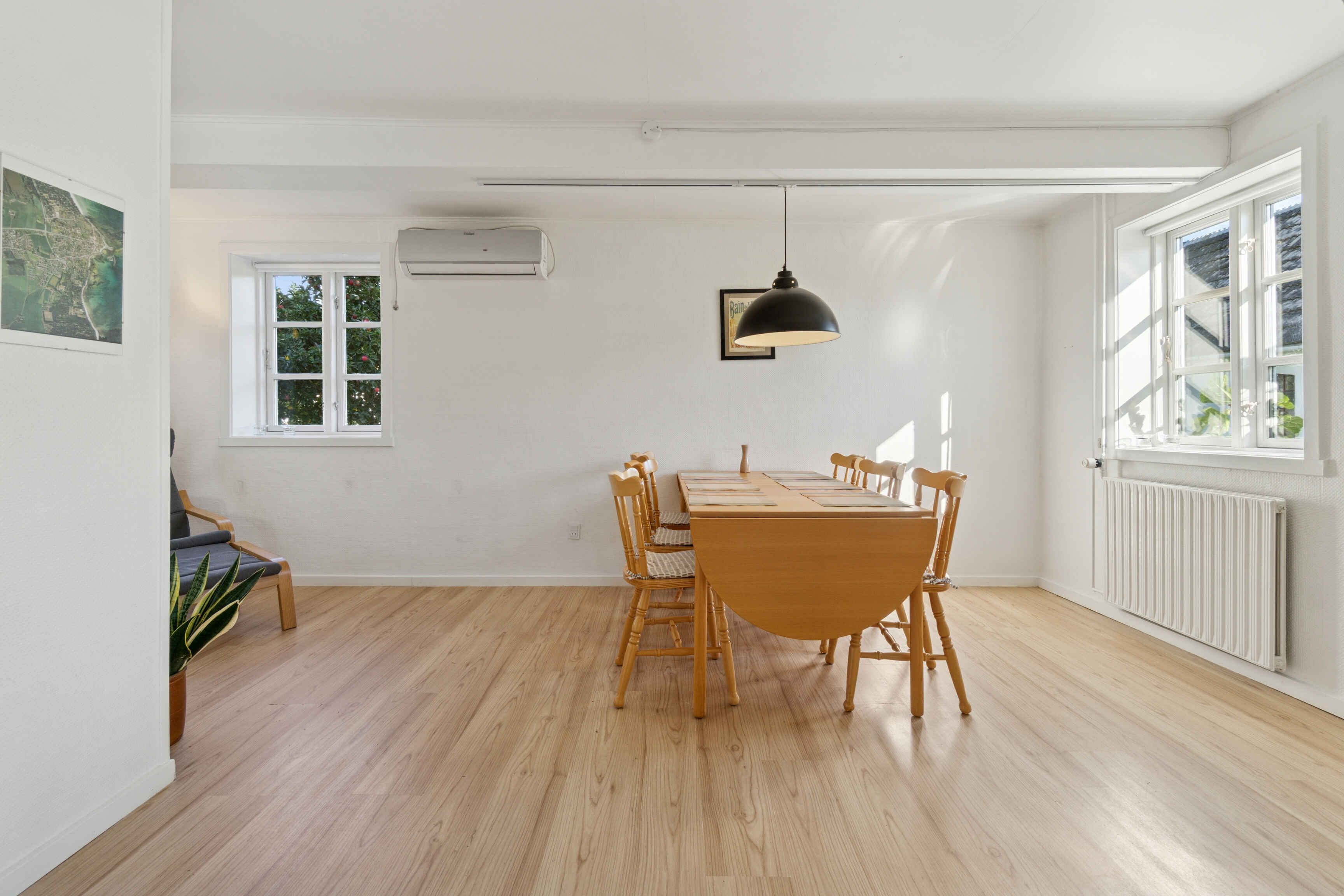 Indenfor er køkken, spisestue og opholdsstue forbundet, så madlavning og samvær går hånd i hånd. Køkkenet er adskilt, men stadig tæt på spiseområdet, hvilket skaber gode rammer for måltider og fælles hygge.