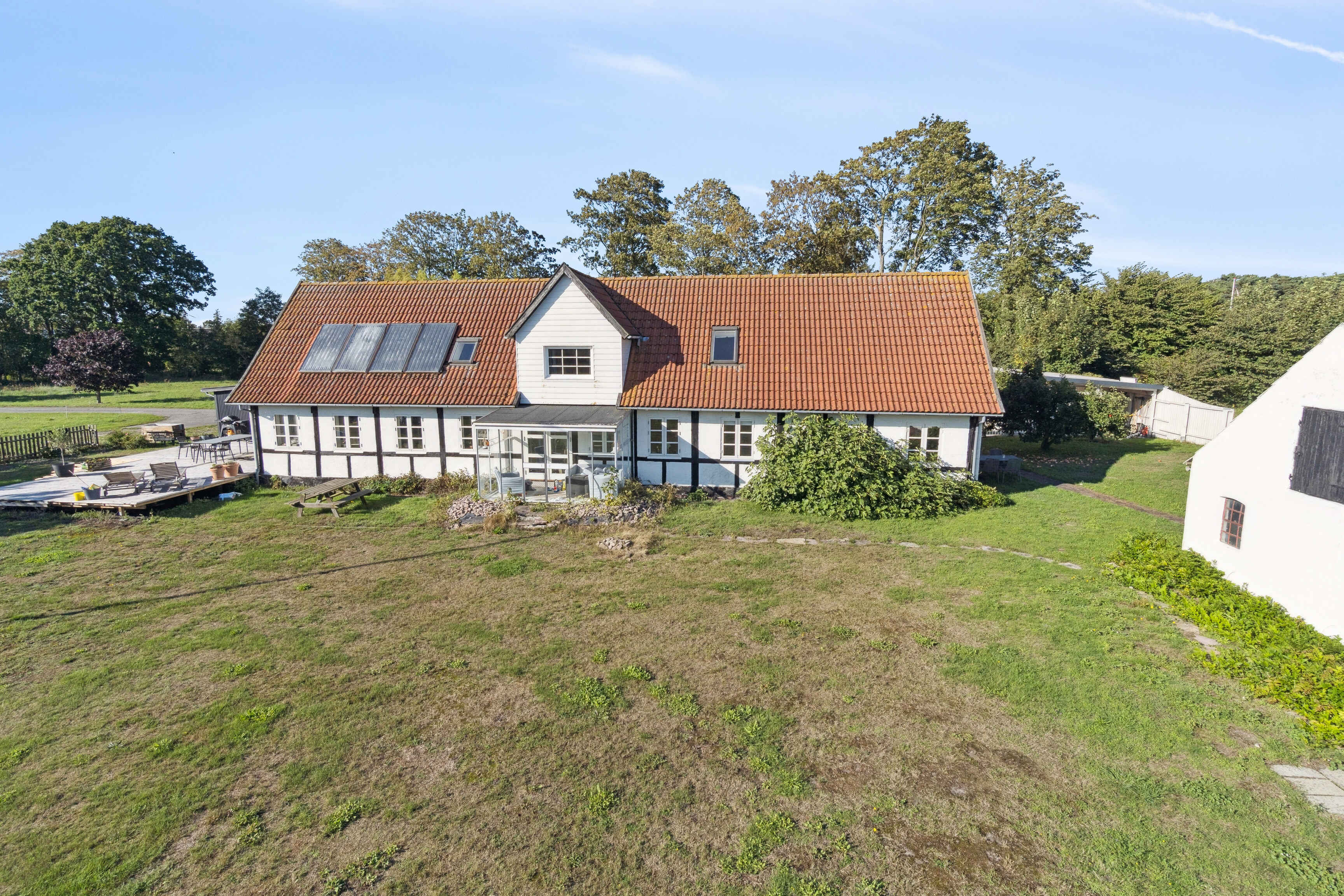 Indenfor er køkken, spisestue og opholdsstue forbundet, så madlavning og samvær går hånd i hånd. Køkkenet er adskilt, men stadig tæt på spiseområdet, hvilket skaber gode rammer for måltider og fælles hygge.