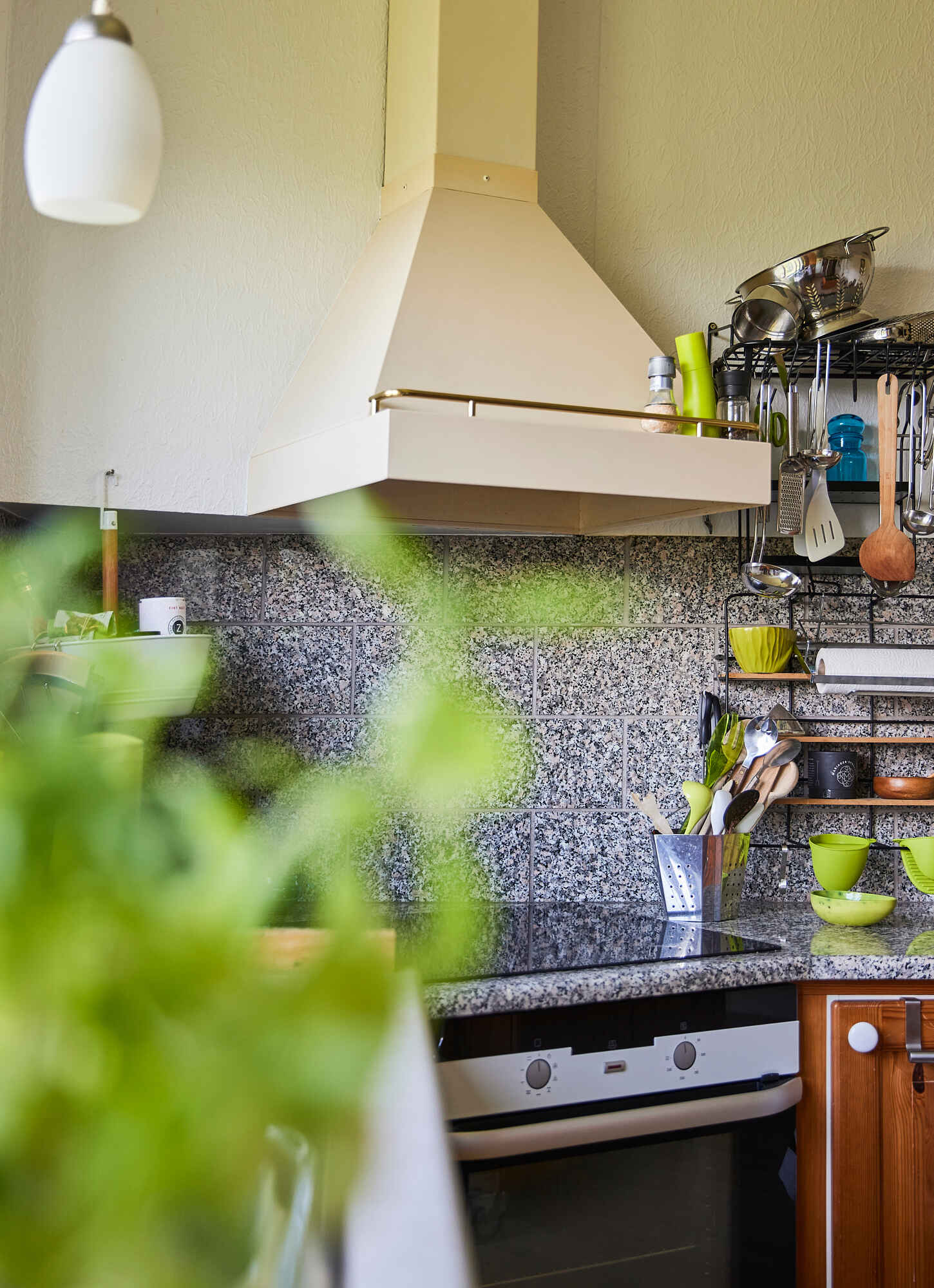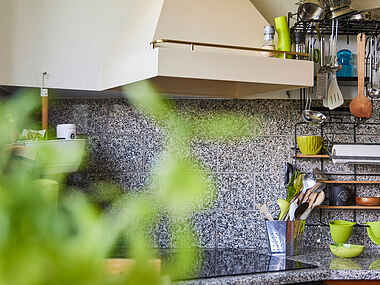 Køkkenet er rummeligt og funktionelt med spiseplads og alt, hvad der skal bruges til feriemadlavning. Her kan du nyde måltiderne med udsigt til det fredelige, uforstyrrede naturområde omkring huset.