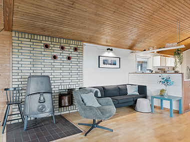 Sommerhuset er godt indrettet med køkken og stue i åben forbindelse, så samvær og nærvær er i fokus. De store vinduespartier mod syd gør, at udsigten og havet kommer helt ind stuen. Der er masser af gamle originale detaljer fra huset blev bygget i 1968, og det gør at man mærker hyggen og roen på en særlig måde.