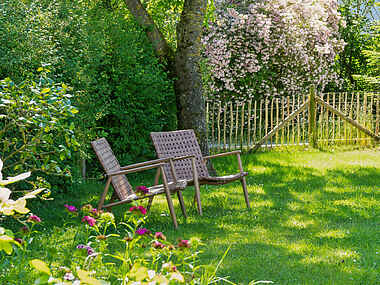 Grunden er stor og haven er indhegnet, så du kan lade eventuelle hunde eller små poder lege frit under æbletræerne. Du kan smutte igennem træer og buske på de små stier, der leder gennem et gammelt stengærde, og pludselig står du med de åbne vidder foran dig; udlejers private vilde marker og enge.