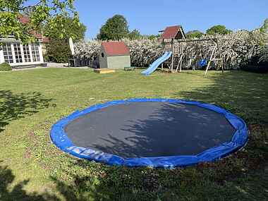 klatrestativ, gynger, legehus, trampolin og meget legetøj, samt spil.
