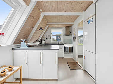 Fra stuen på første sal er der udsigt over havet. Herfra kan man følge dagens skiftende lys og se solen forsvinde bag horisonten. I stueplan ligger den lyse udestue, der forlænger sommeren og inviterer til måltider eller stille stunder, uanset vejret.