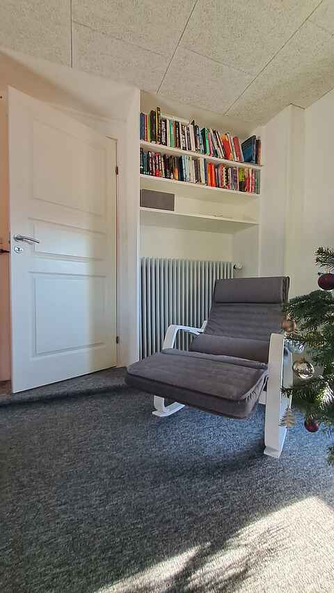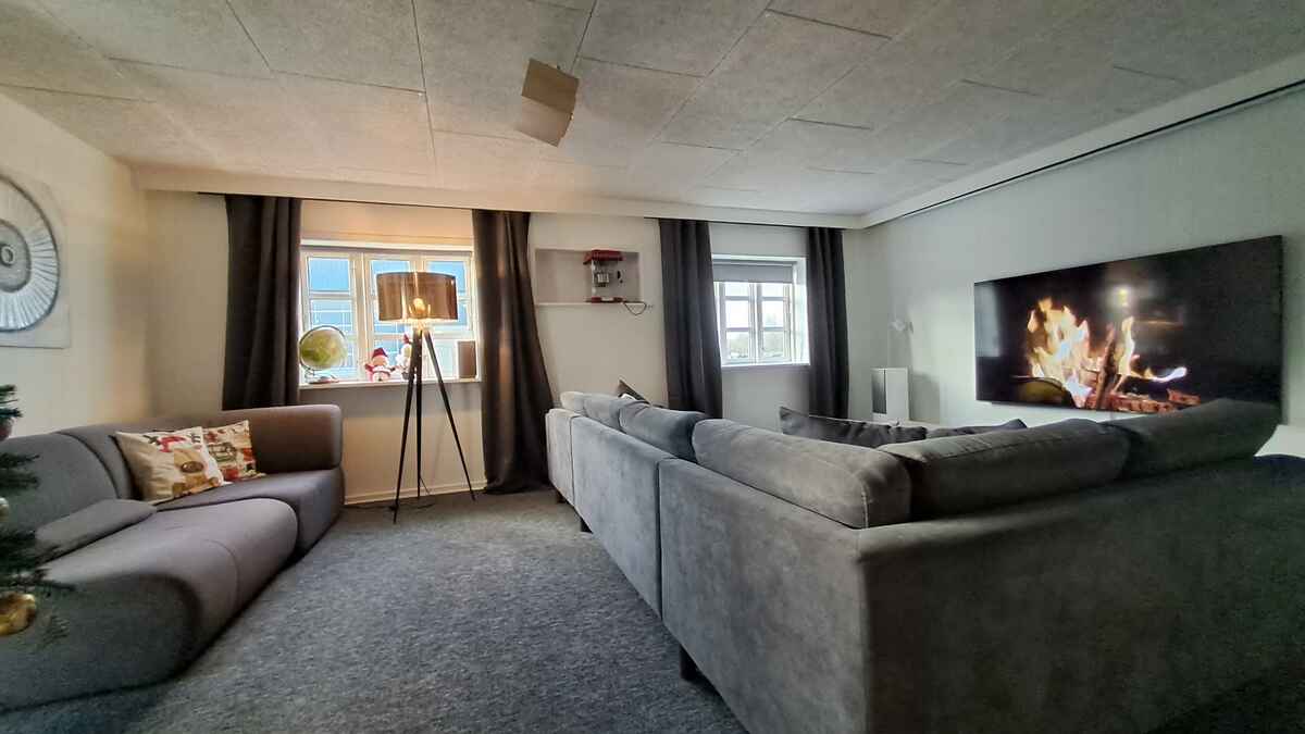 Stuen er indrettet til samvær og hygge. Her finder du et smart-tv samt et stort biograflærred til film og spil samt en brændeovn, der kan tændes på kølige aftener. Internet er tilgængeligt i hele huset, så du kan være online, når det ønskes.