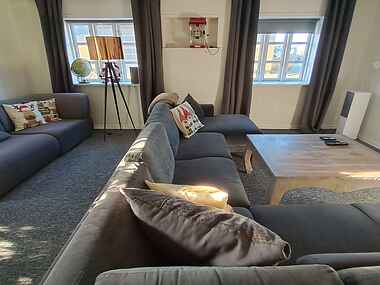 Stuen er indrettet til samvær og hygge. Her finder du et smart-tv samt et stort biograflærred til film og spil samt en brændeovn, der kan tændes på kølige aftener. Internet er tilgængeligt i hele huset, så du kan være online, når det ønskes.