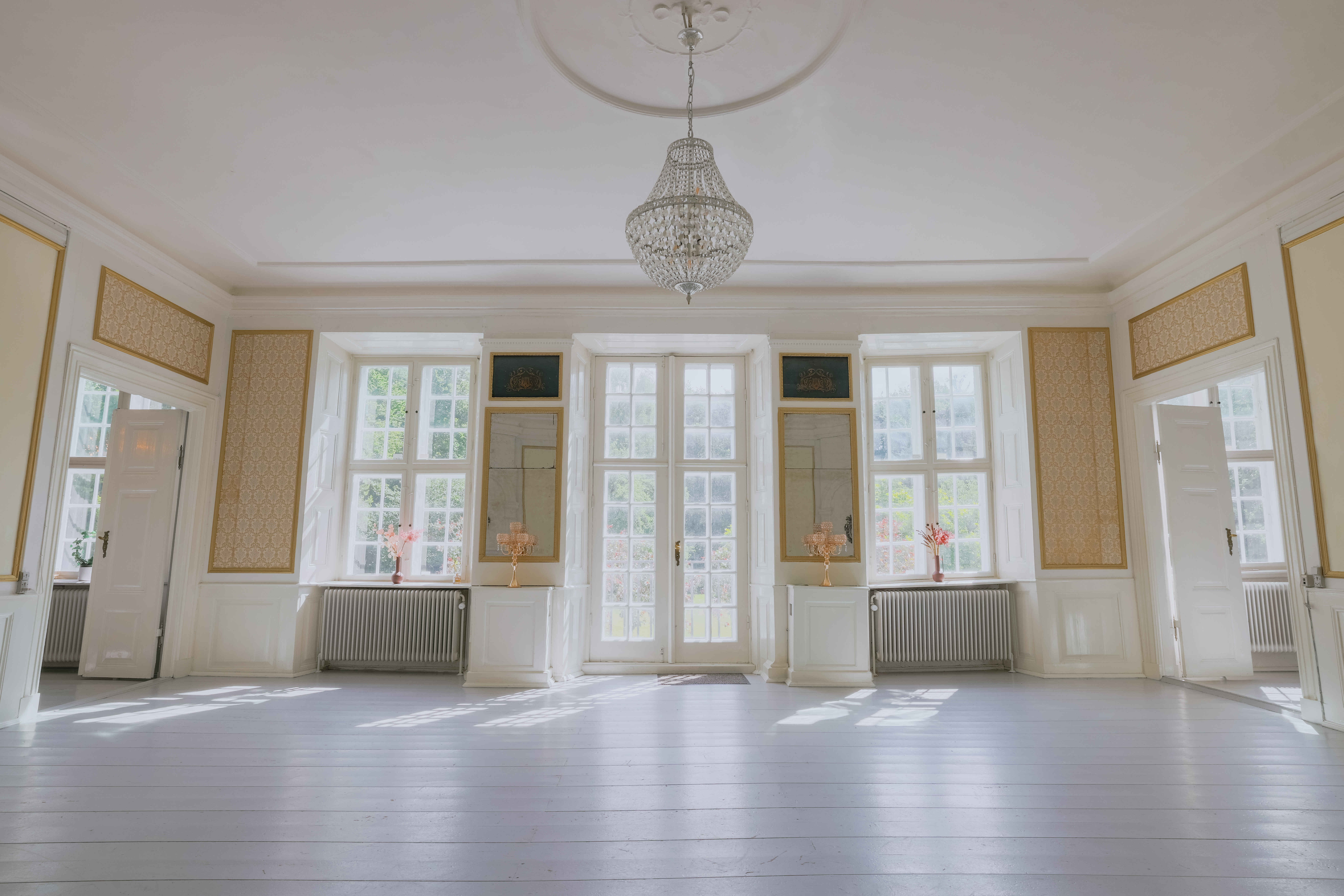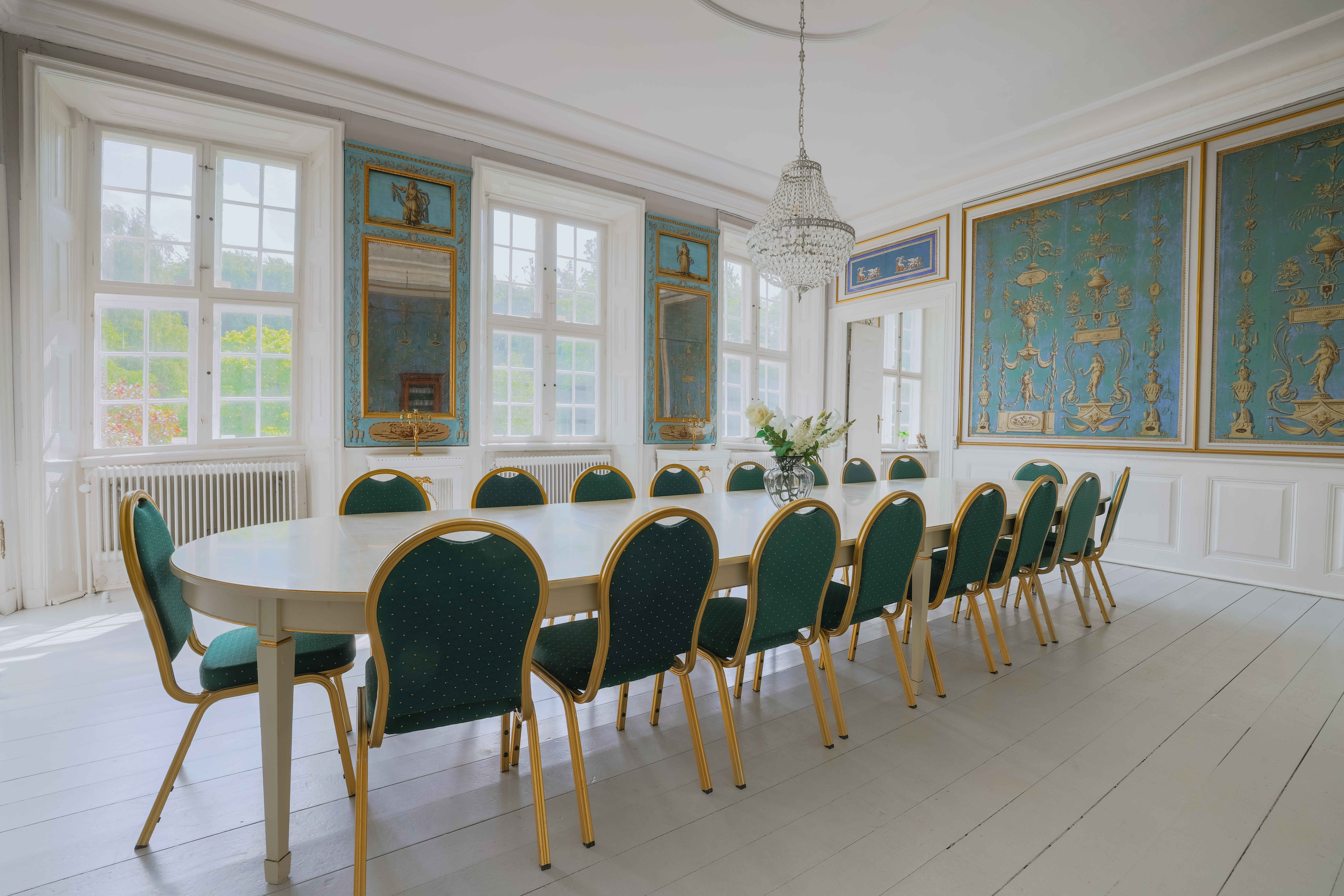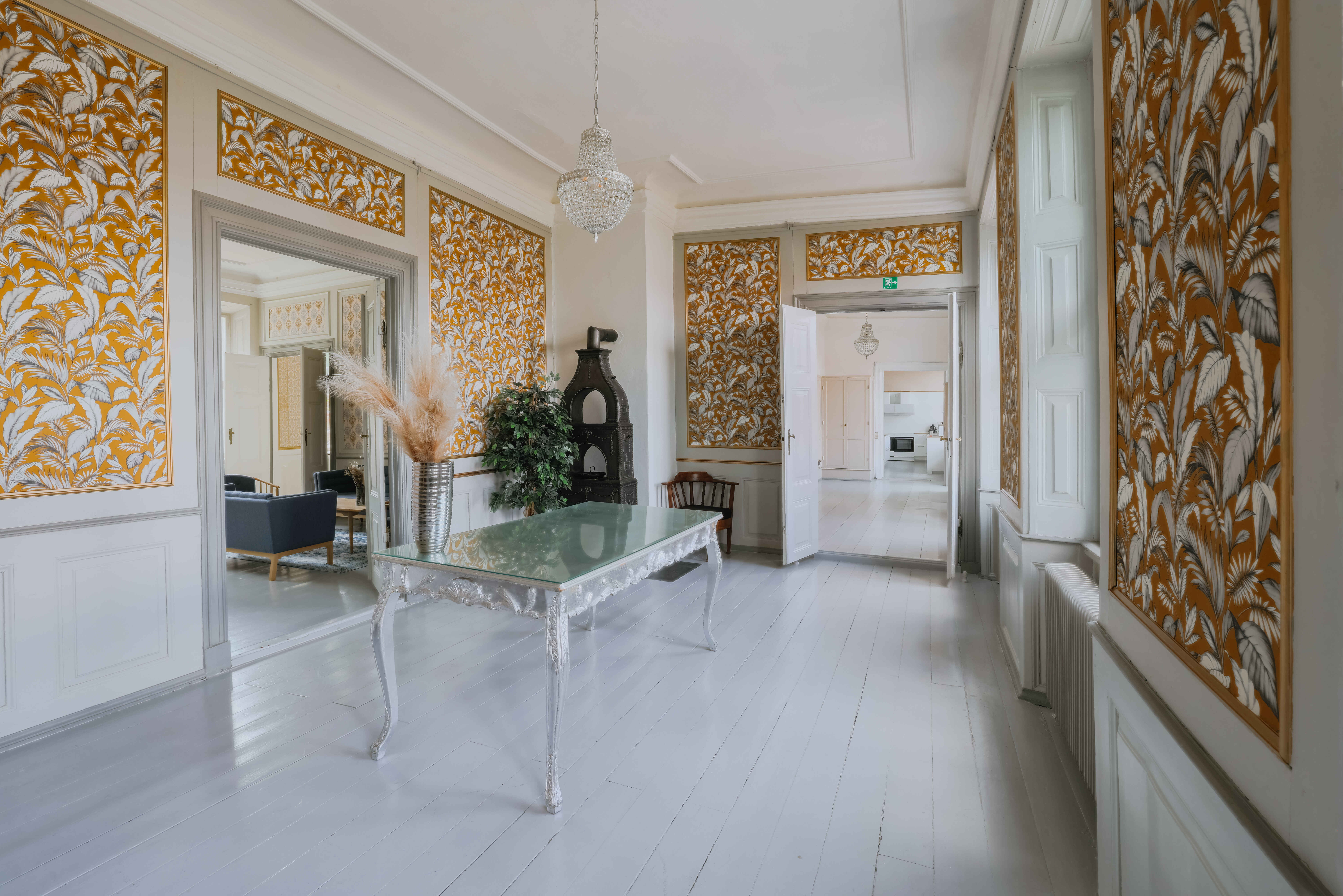 Hindemae er et historisk gods i stor skala, hvor den hvide hovedbygning fremstår gennemført renoveret med respekt for de oprindelige detaljer. De 1200 m² rummer 14 soveværelser, 4 badeværelser, 2 gæstetoiletter og flere stuer, der giver gæsterne god plads til samvær og ro.