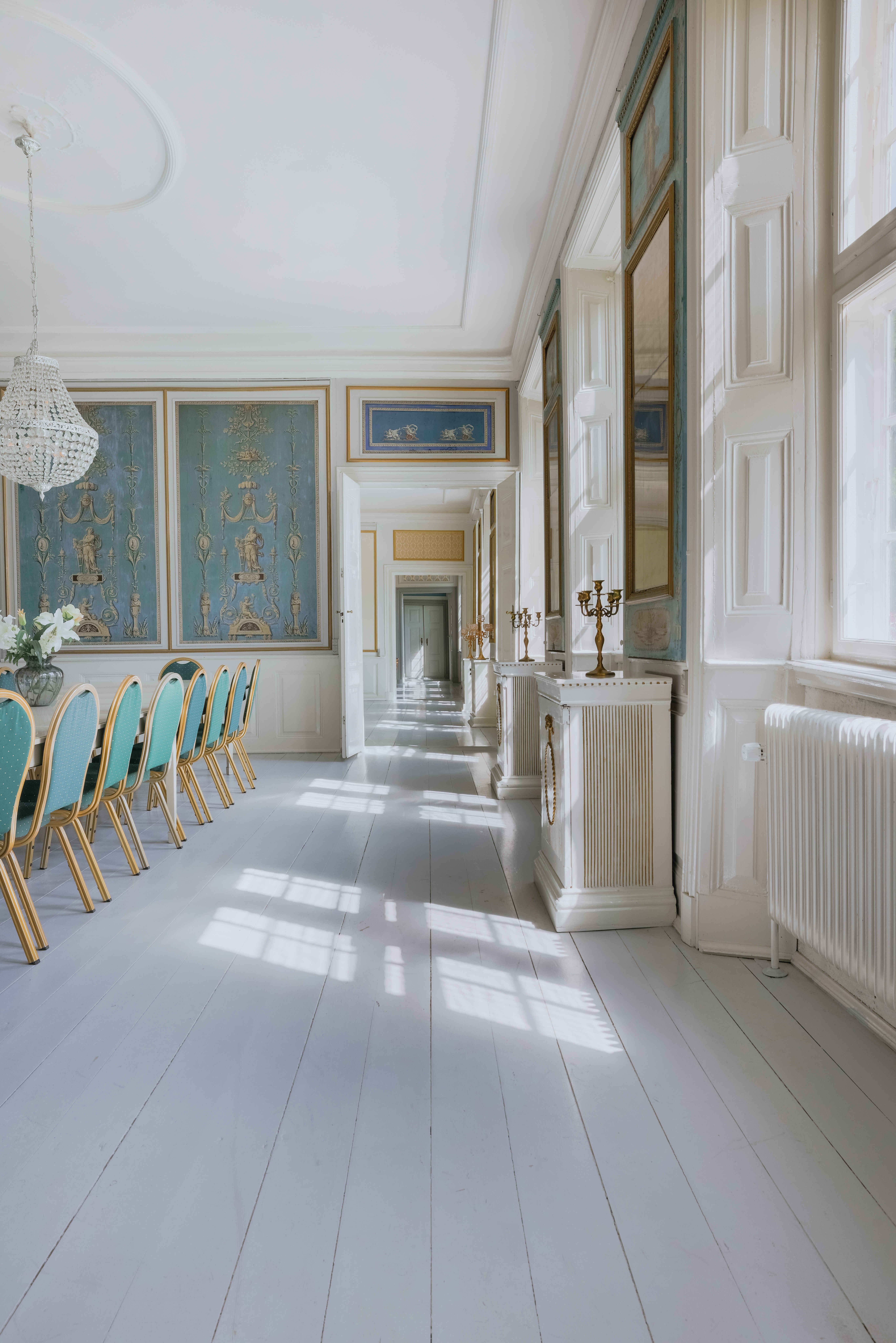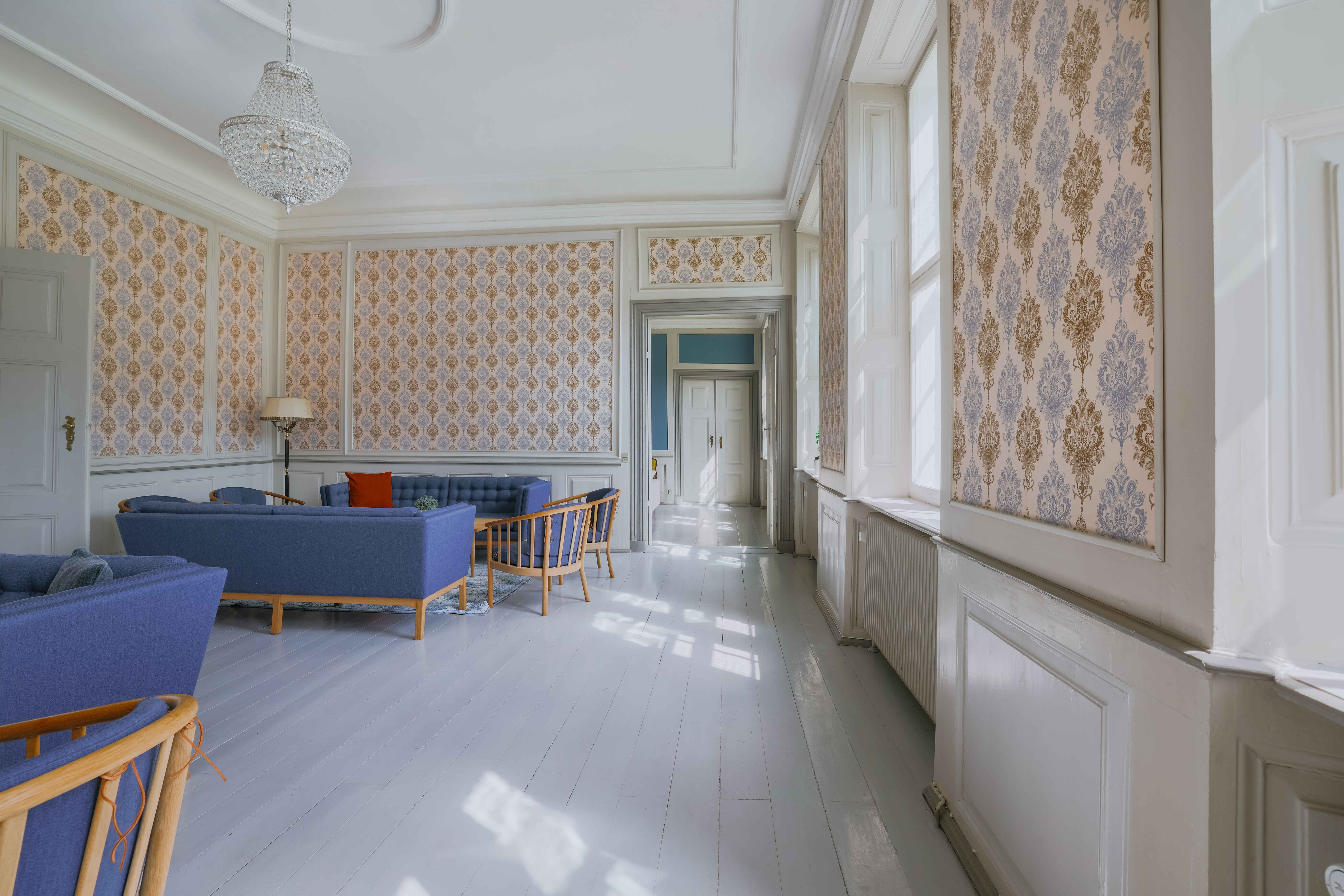 Hindemae er et historisk gods i stor skala, hvor den hvide hovedbygning fremstår gennemført renoveret med respekt for de oprindelige detaljer. De 1200 m² rummer 14 soveværelser, 4 badeværelser, 2 gæstetoiletter og flere stuer, der giver gæsterne god plads til samvær og ro.