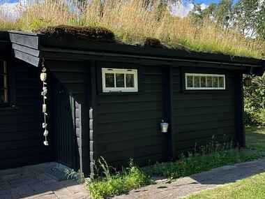 Autentisk norsk bjælkehytte med græs på taget – Her er lagt op til ro, hygge og nærvær.