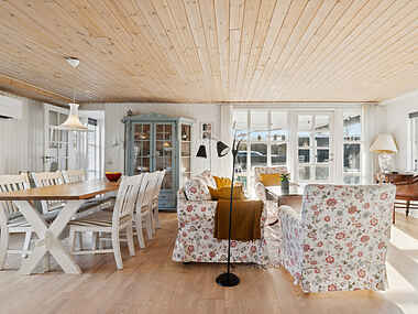 Det klassiske sommerhus på 90 m² giver en rolig ramme om ferien. Det hyggelige køkkenalrum samler alle til måltider og samvær, mens sofasektionen indbyder til afslapning foran brændeovnen på kølige dage. Indretningen er enkel, lys og rar at opholde sig i.