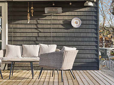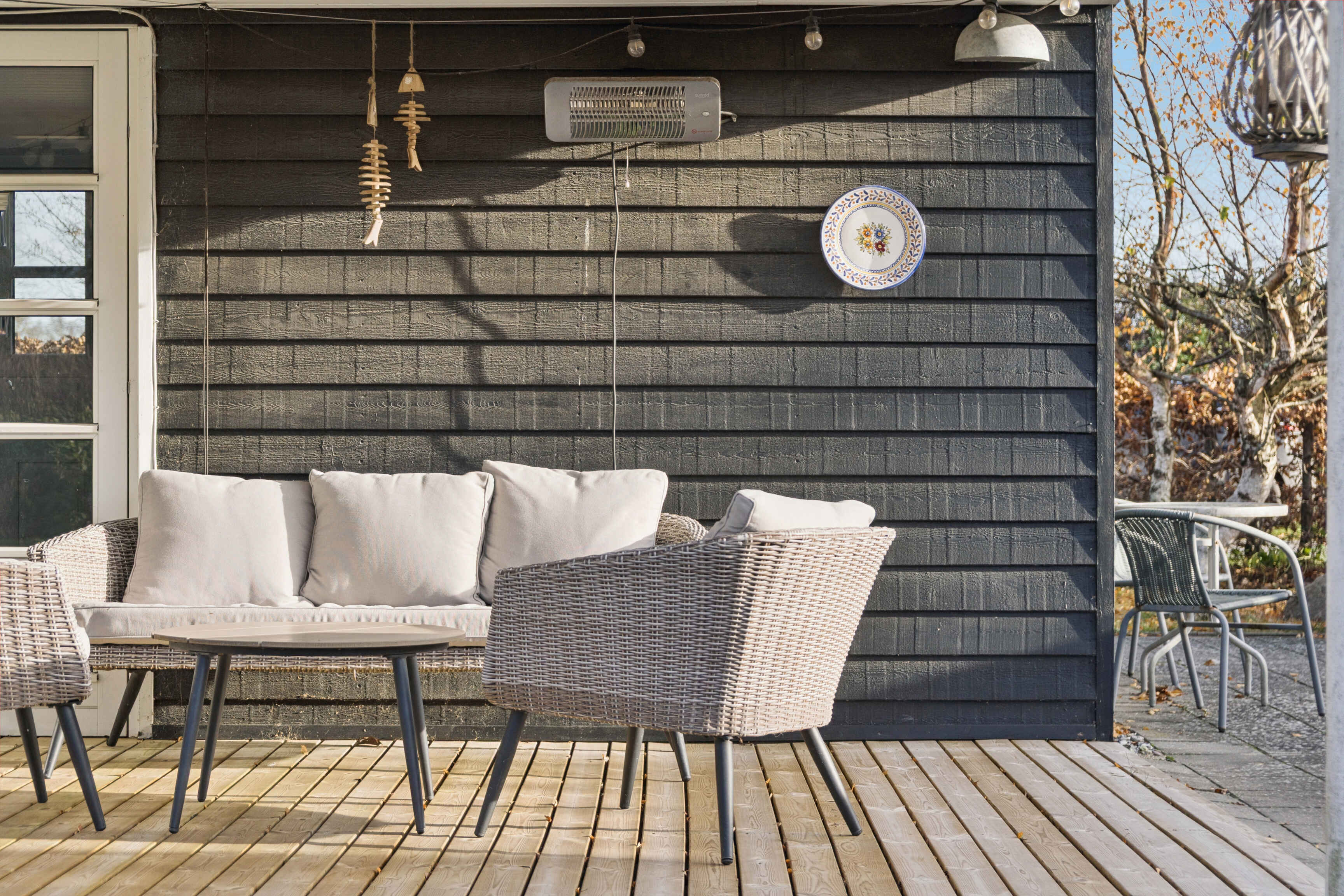 Udenfor finder man en overdækket terrasse med loungemøbler, hvor sommeraftener kan nydes i læ for vinden. Den store grønne græsplæne ligger på en indhegnet grund, hvilket gør det trygt at lade børn og hund færdes frit. Terrassen forlænger dagen og gør udelivet nemt og behageligt.