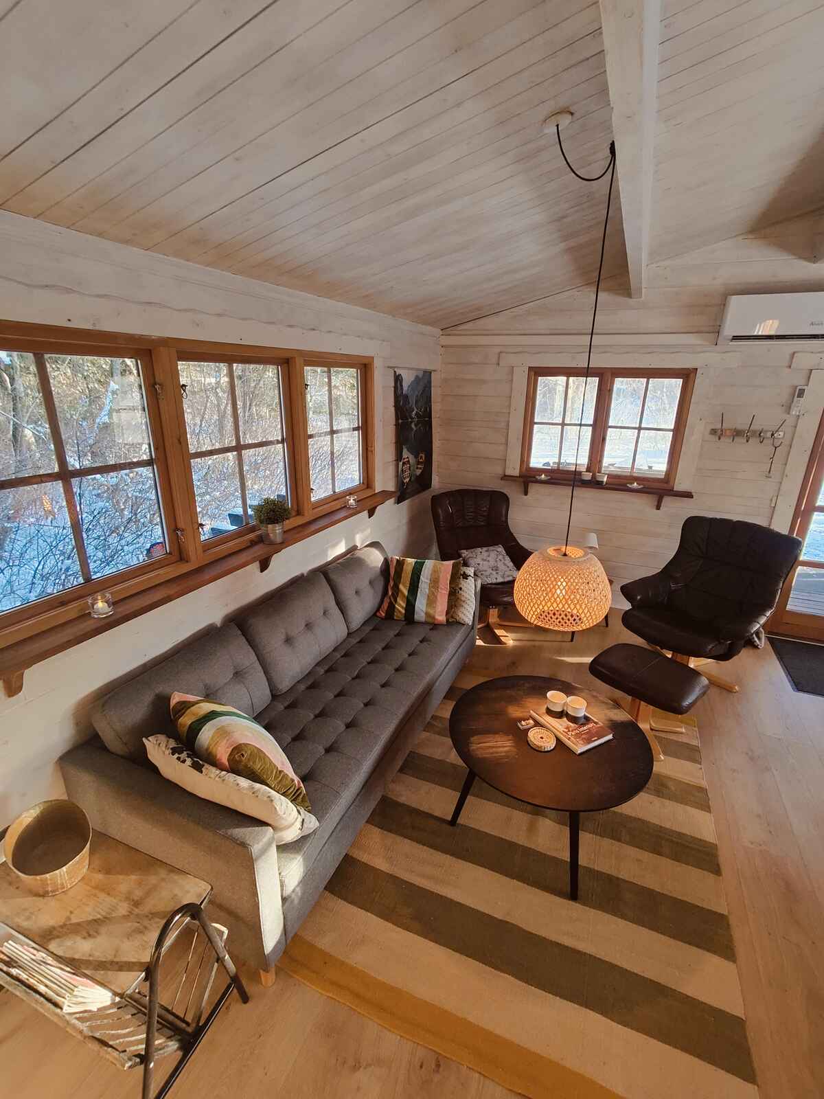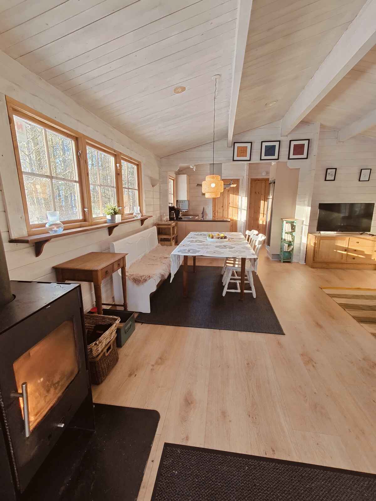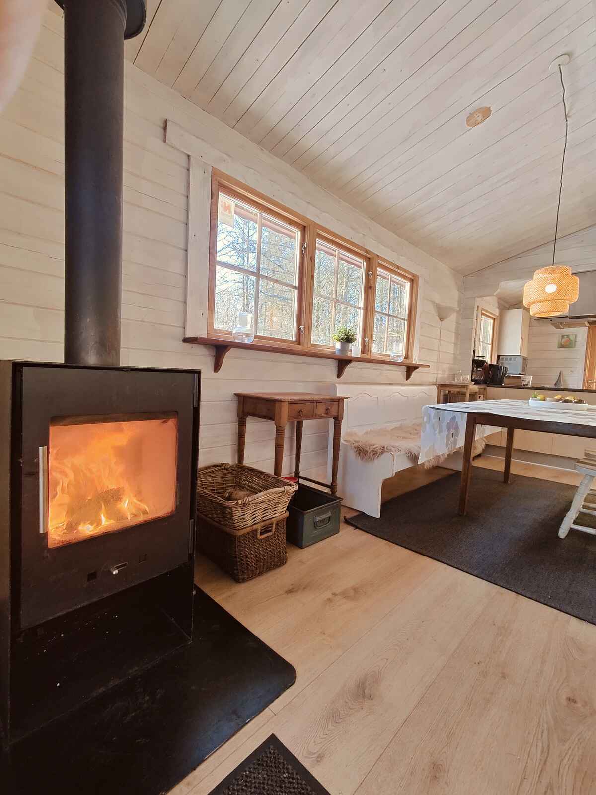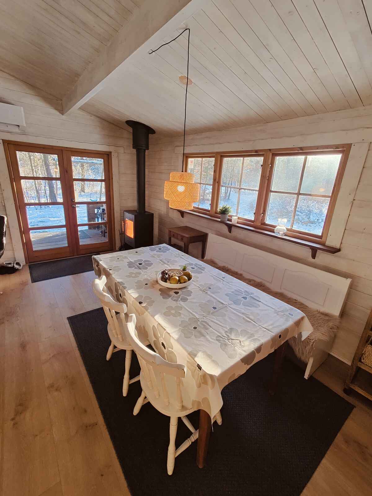 Grunden er delvist ugenert og omgivet af natur med rigt dyreliv. Her kan man slappe af på terrassen, nyde aftener foran brændeovnen eller gå på opdagelse i nærområdet. Huset tilbyder både åben og overdækket terrasse, så udendørs ophold kan nydes uanset vejret.