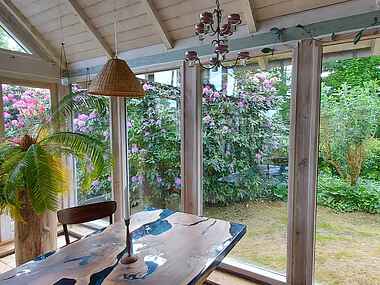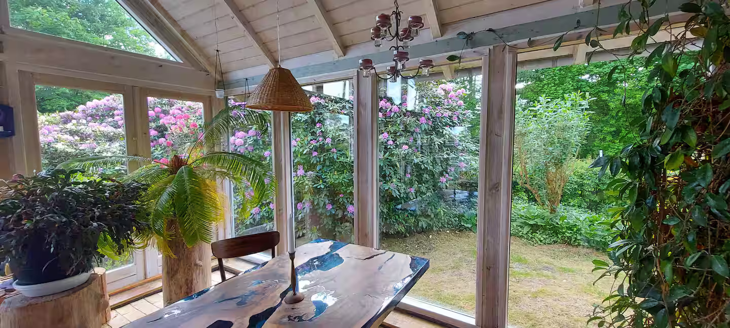 En særlig kvalitet ved huset er den unikke havestue, som trækker naturen helt ind i boligen. Her kan I nyde måltider, læse eller slappe af med udsigt til omgivelserne og skiftende lys gennem dagen.