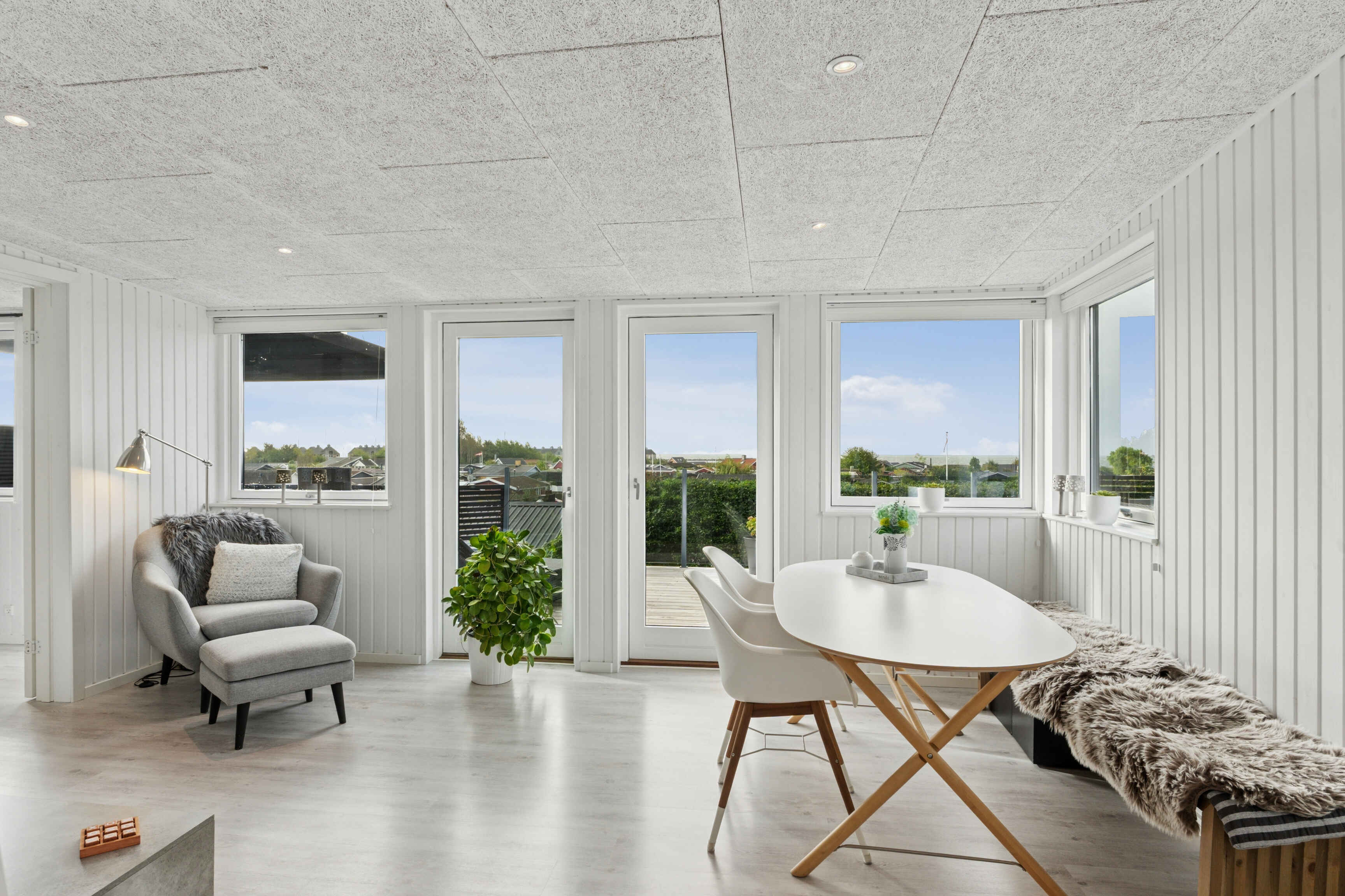 Dette sommerhus på 61 m² er indrettet med tre soveværelser og seks sovepladser. Huset fremstår lyst og venligt med en funktionel planløsning, hvor køkken og stue hænger naturligt sammen. Fra stuen er der udgang til en terrasse med udsigt over vandet, hvor måltider kan nydes i det fri.