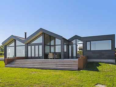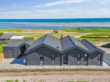 Helt ud til vandet ligger dette 120 m² sommerhus fra 2023, hvor udsigten er en del af hverdagen. Havet er det første, man ser, når man træder ind, og store vinduespartier trækker lyset og kystlandskabet helt ind i boligen.