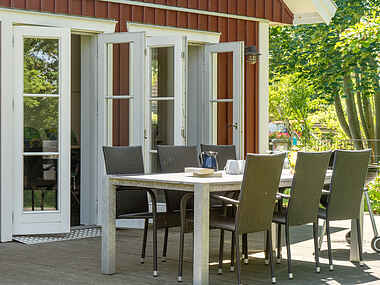 Køkkenet er udstyret med integreret køl/frys og opvaskemaskine. Udenfor finder du store terrasser mod både vej og have med grill og gode havemøbler. På grunden er der shelter, bænke og bålplads, hvilket gør det oplagt at nyde udelivet fra morgen til aften.