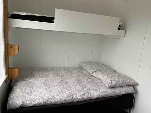 På første sal ligger to værelser og en hems. Det store værelse har dobbeltseng og skabe, mens det lille rummer en mindre dobbeltseng samt en ekstra seng ovenpå. Hemsen tilbyder en ekstra dobbeltseng. Alt inventar og alle møbler er fra renoveringen i 2021.