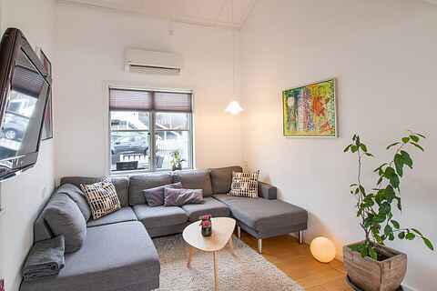 Indenfor mødes I af en entré med god plads til overtøj, et rummeligt badeværelse og et åbent opholdsrum med køkken, spiseplads og stue. Køkkenet rummer alt til madlavning, mens stuen giver adgang til den hyggelige terrasse og forhave, som er indhegnet for ekstra tryghed.