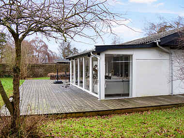 De store vinduespartier i udestuen sikre et dejligt lysindfald i huset. Herfra er der direkte udgang til terrassen med grill og havemøbler. Til børnene er der masser af spil og en trampolin.