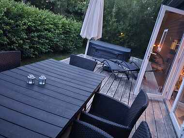 Sommerhuset byder på dejlig lys stue i åben forbindelse til køkkenet med hyggelig spiseplads. Fra stuen adgang til den store terrasse, der går hele vejen rundt om huset og byder på både sol og skygge.