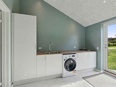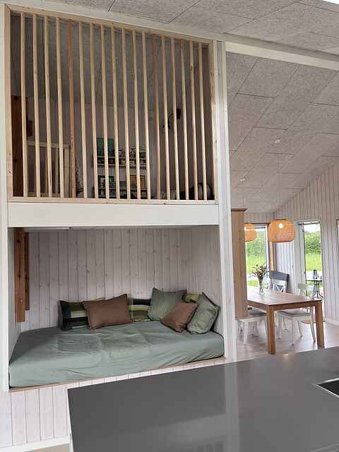 Sommerhuset er nybygget i 2025 dvs. der bygges stadig på huset. Man kan ikke se legstativ/gynger/rutsjebane på billederne.