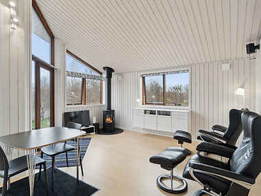 Huset har en funktionel indretning med et åbent køkken og opholdsområde, der skaber et indbydende miljø til hyggelige aftener. Brændeovnen gør opholdet særligt behageligt, når mørket falder på.