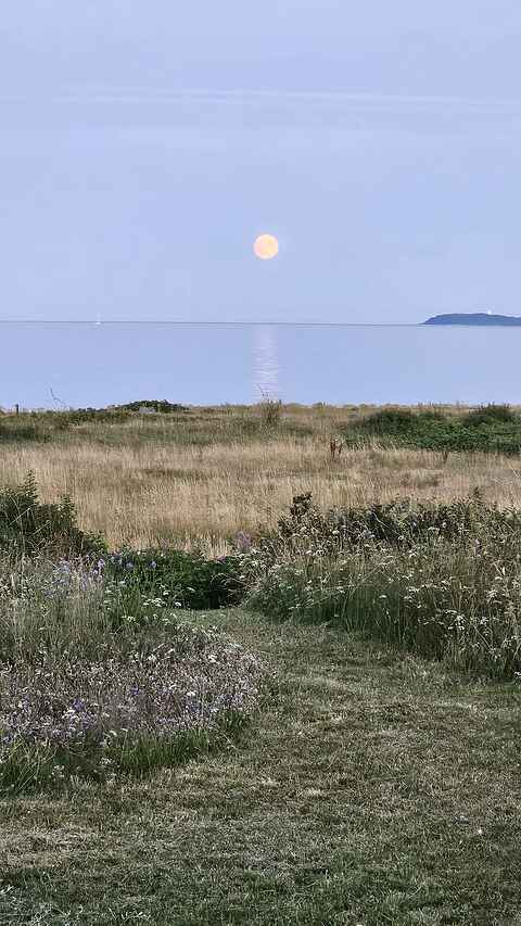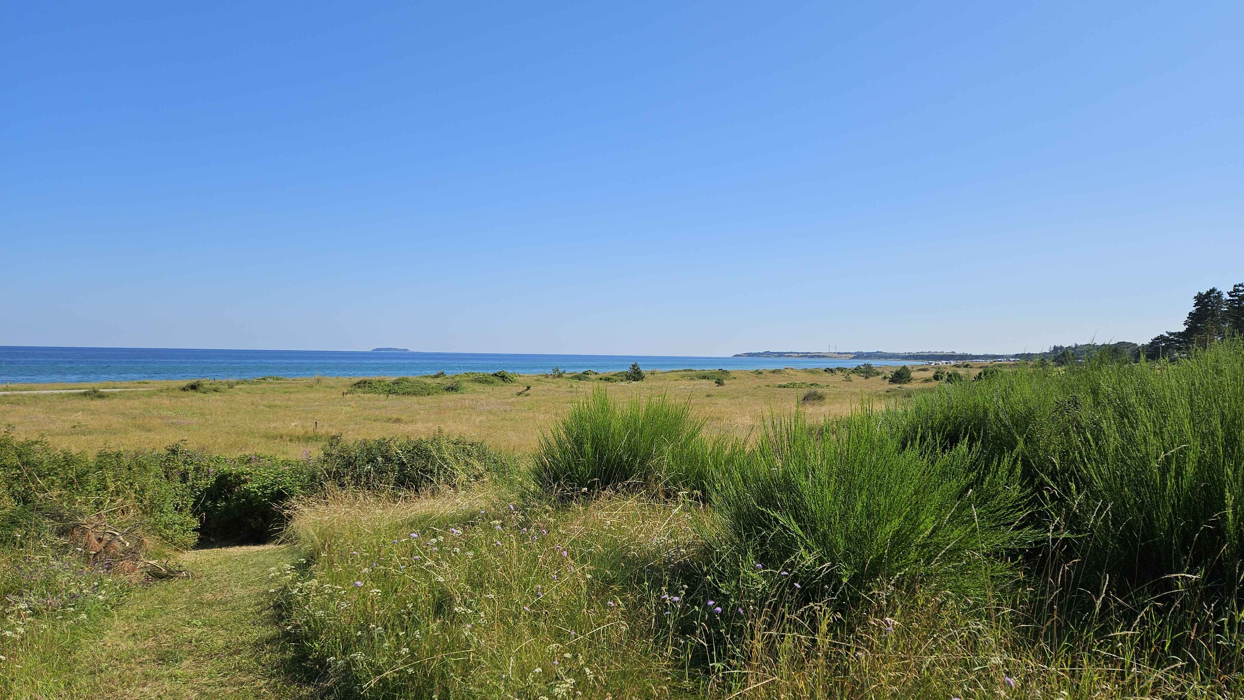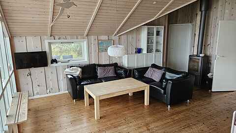 Fra stuen åbner et stort vinduesparti mod havet. Her får du en imponerende 180 graders udsigt, og med direkte adgang til stranden bliver havet en naturlig del af ferien. Den store terrasse og den 1600 m² store naturgrund giver mulighed for både afslapning og leg.