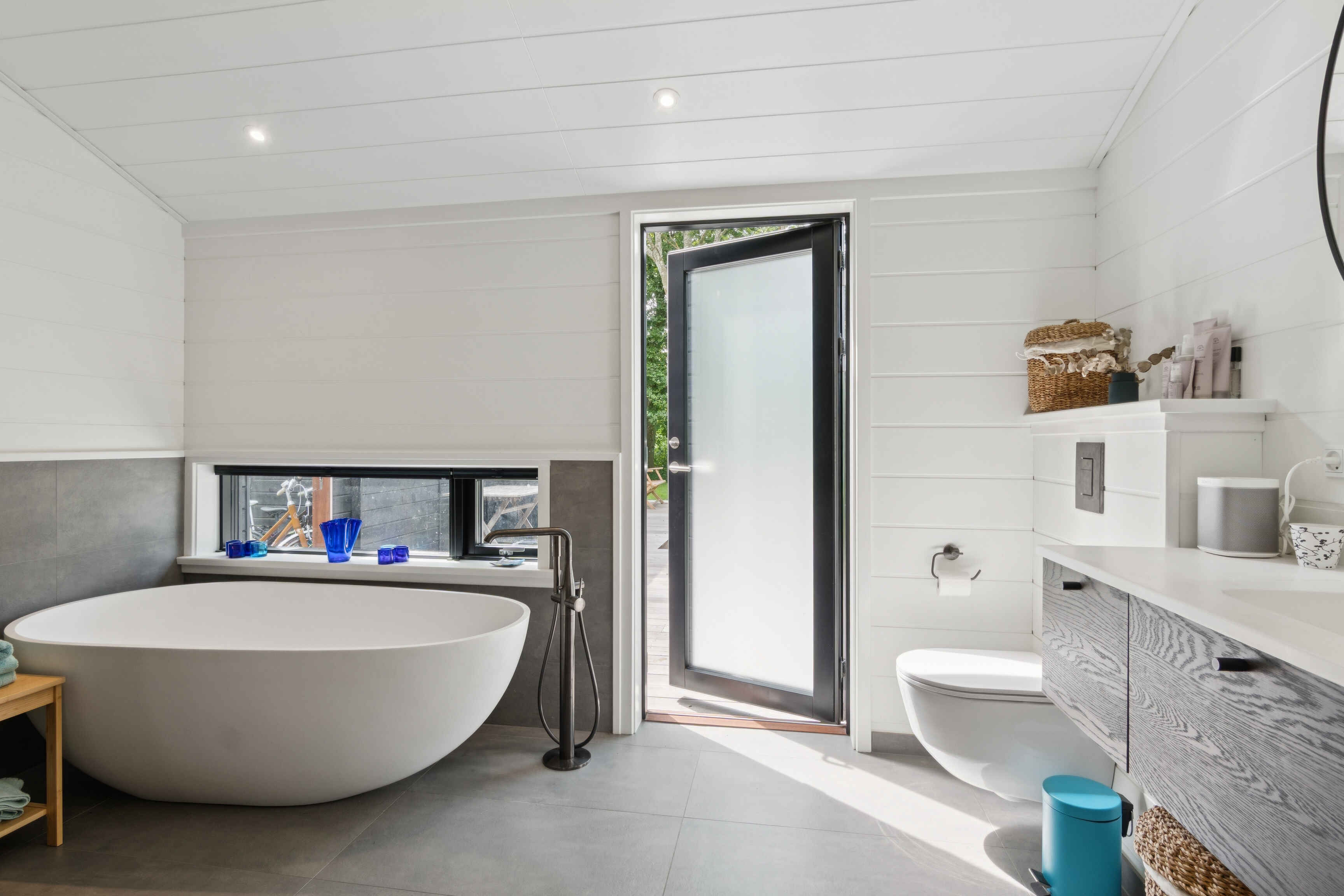 To badeværelser gør opholdet komfortabelt, og det ene er indrettet med badekar. Hertil kommer både sauna og udendørs vildmarksbad, som skaber mulighed for velvære i afslappede rammer.