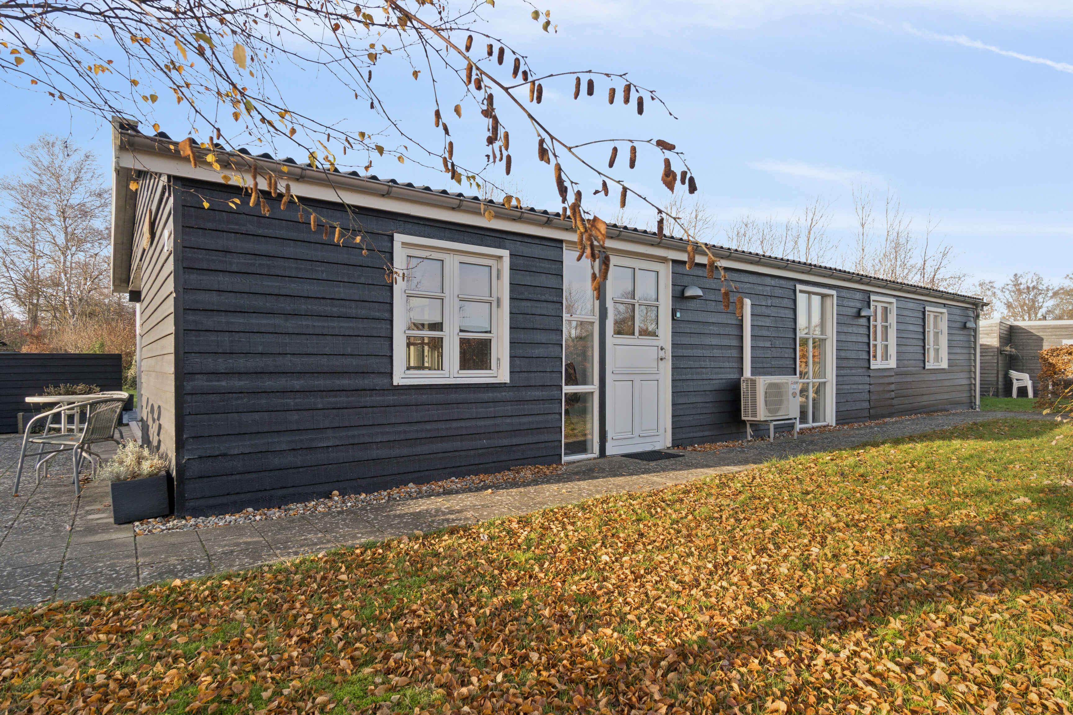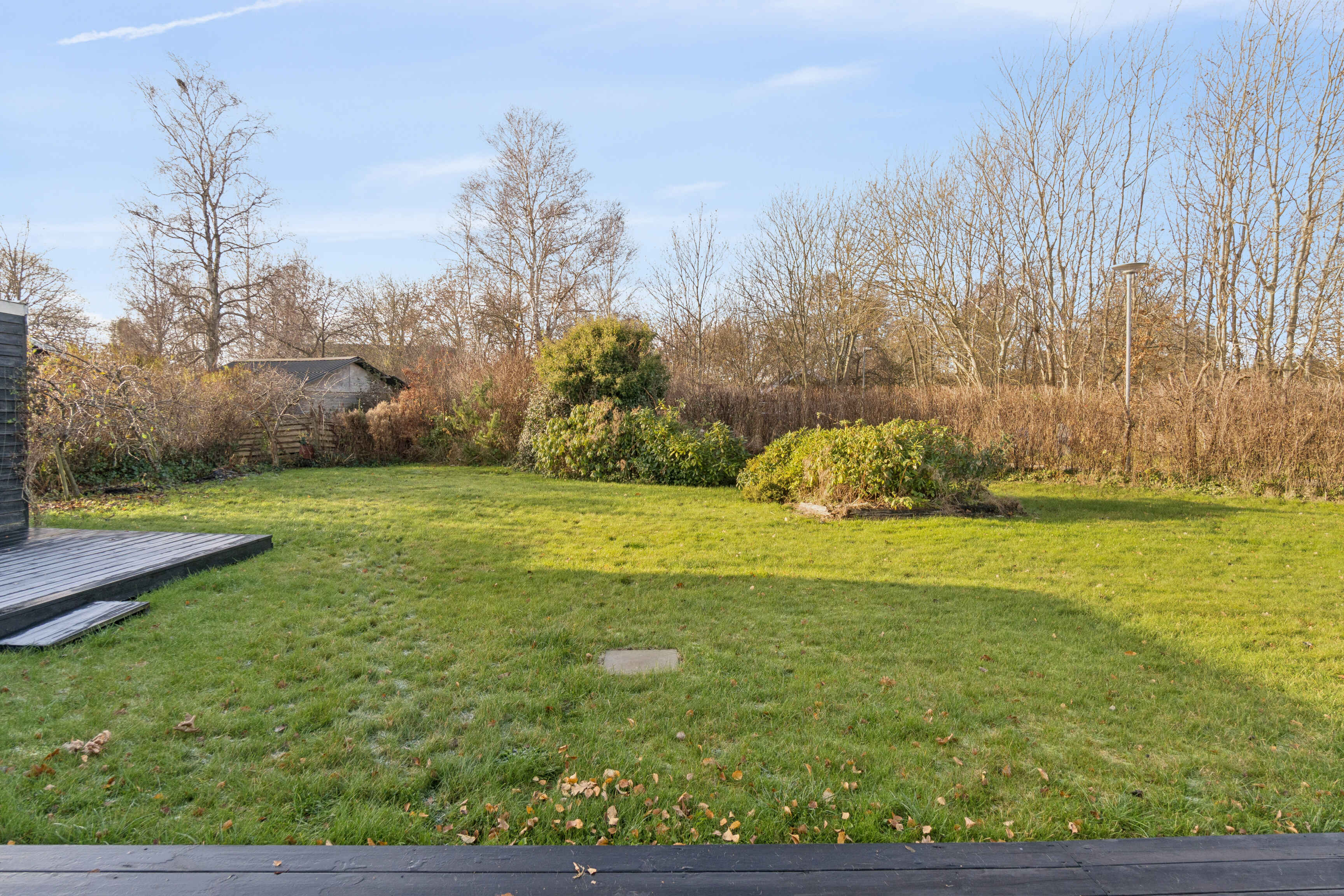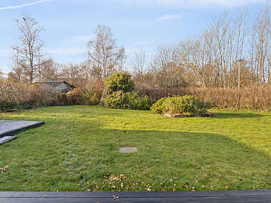Udenfor finder man en overdækket terrasse med loungemøbler, hvor sommeraftener kan nydes i læ for vinden. Den store grønne græsplæne ligger på en indhegnet grund, hvilket gør det trygt at lade børn og hund færdes frit. Terrassen forlænger dagen og gør udelivet nemt og behageligt.