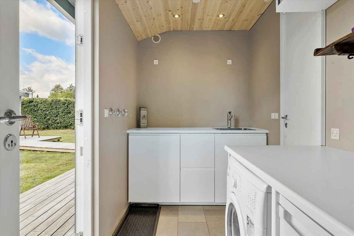 Kun 50 meter fra huset ligger en større offentlig legeplads med boldbane, hvilket gør området særligt attraktivt for børnefamilier. Samtidig er der kort afstand til vandet – cirka 1 km til stranden – som er kendt for sit rolige og børnevenlige badevand.