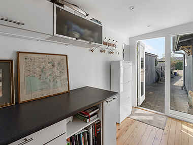 Den private terrasse er delvist overdækket, og det er muligt at lukke den overdækkede terrasse helt af, hvis vejret er til den kolde side.