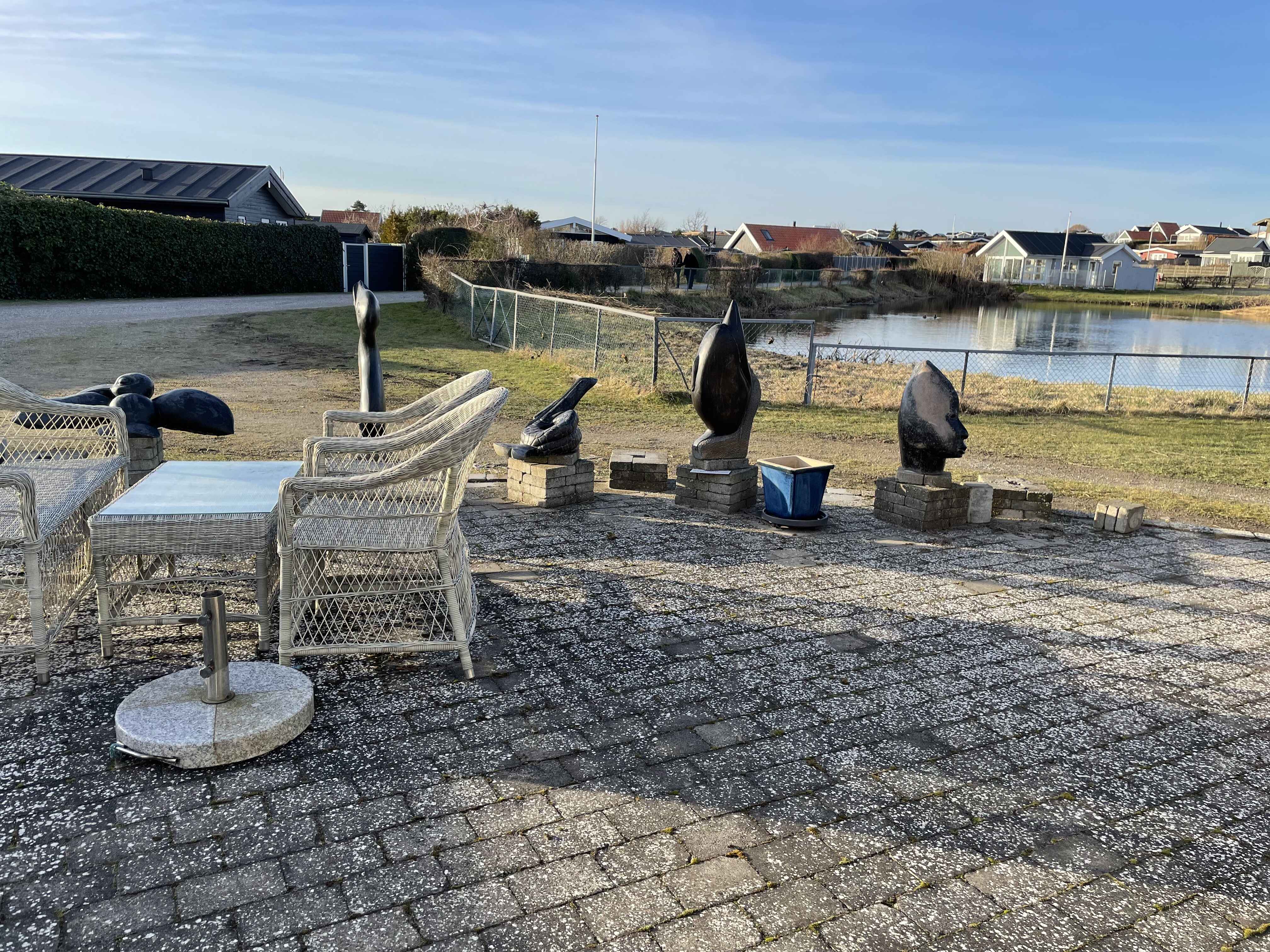 Sommerhuset er smukt og hyggeligt. Når du ankommer til huset, bliver du mødt af kunst og skulpture – der er i alt 25 stykker stenkunst. Det næste der møder dig er at huset ligger på en hjørnegrund med udsigt til en lille sø og med udsigt til en stille vej, med livlig trafik af badegæster enten på vej til stranden eller hjem fra den.