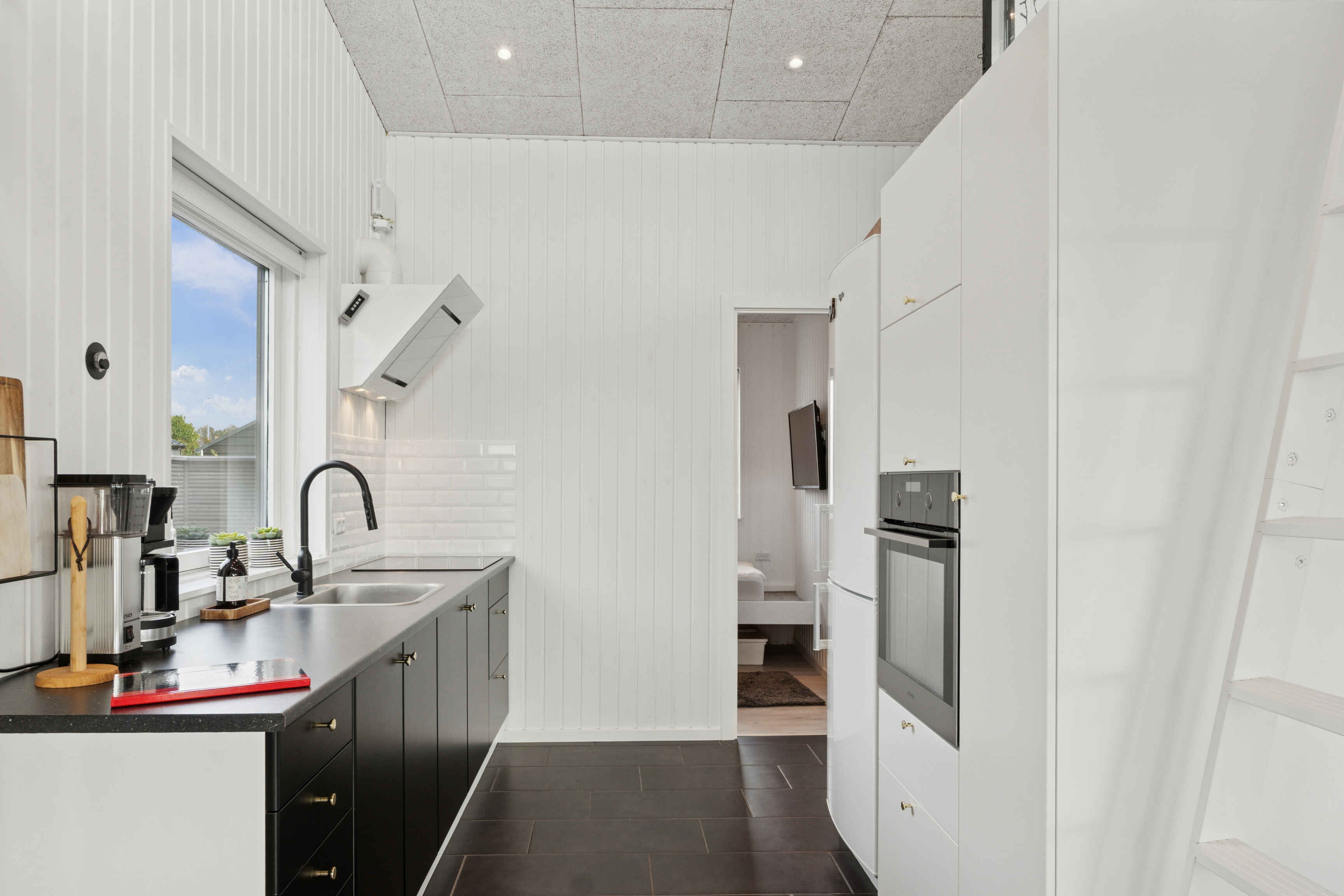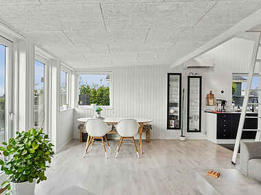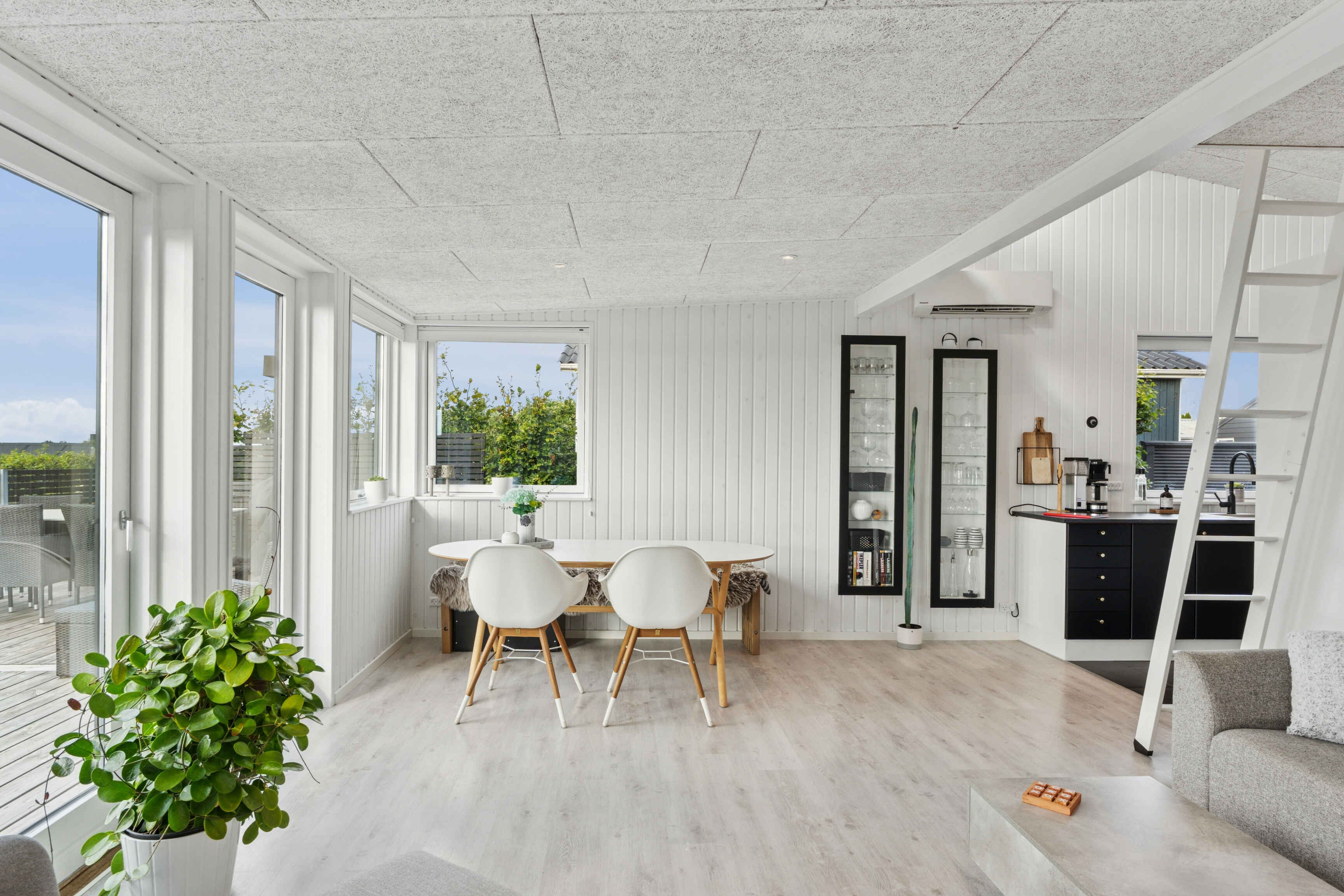 Dette sommerhus på 61 m² er indrettet med tre soveværelser og seks sovepladser. Huset fremstår lyst og venligt med en funktionel planløsning, hvor køkken og stue hænger naturligt sammen. Fra stuen er der udgang til en terrasse med udsigt over vandet, hvor måltider kan nydes i det fri.