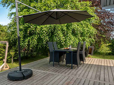 Udenfor venter en grøn have med træer, buske, trampolin til ungerne og plæne til leg og afslapning. Nyd lange aftener på træterrassen, forkæl jer selv i vildmarksbadet, eller prøv en nat i shelteren under åben himmel.