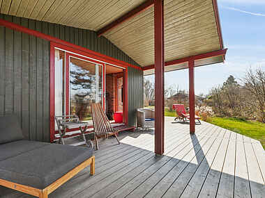 Huset har en hyggelig terrasse, hvor du kan nyde udendørs måltider eller en stille stund med udsigt til vandet. Perfekt til morgenkaffe eller aftensmad på grillen. Byder opholdet på en TV-aften kan ynglingsprogrammerne streames via chromecast .