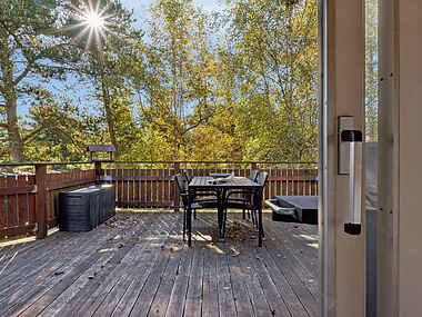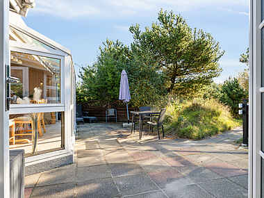 Fritidshuset ligger på en stor, naturskøn grund på 1.109 m2 med en hævet terrasse, hvor I kan nyde udsigten over den kuperede natur. Haven er let at vedligeholde, og de tilhørende udhuse gør det nemt at opbevare strandudstyr eller cykler.