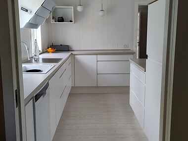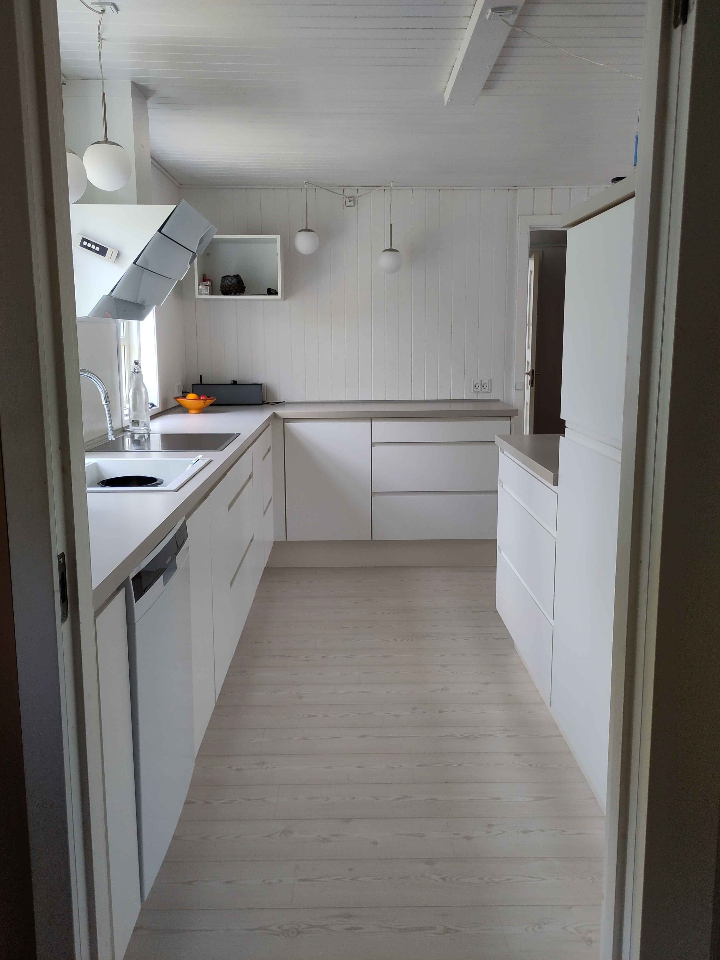 Den store vinkelstue og det åbne køkken giver plads til samvær. Her kan man lave mad, spille spil og nyde måltiderne sammen, mens lyset strømmer ind gennem vinduerne.