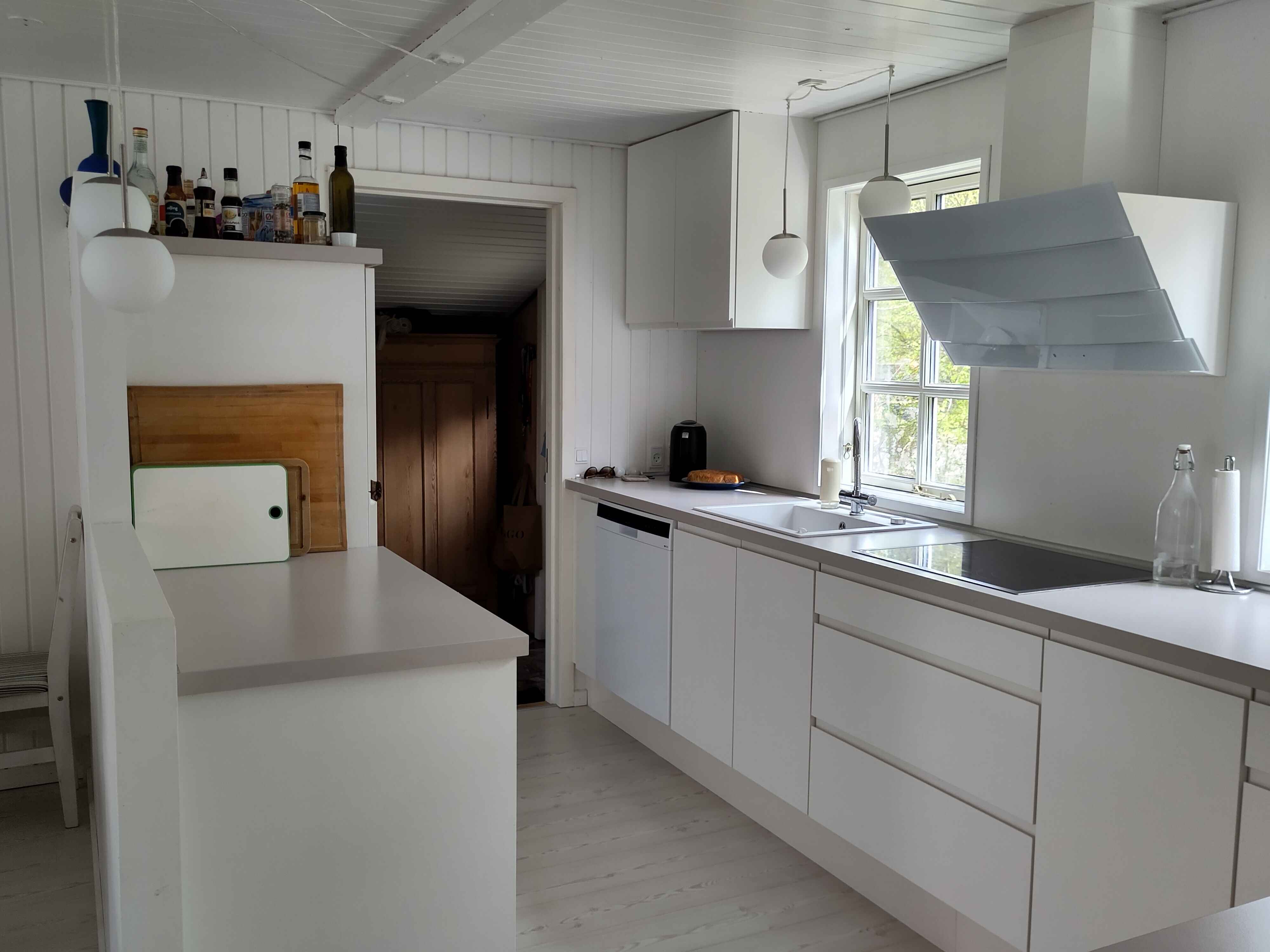 Den store vinkelstue og det åbne køkken giver plads til samvær. Her kan man lave mad, spille spil og nyde måltiderne sammen, mens lyset strømmer ind gennem vinduerne.