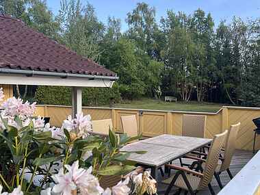 Fra stuen er der udgang til en kæmpe, delvist overdækket lukket træterrasse, med havemøbler, solsenge og grill. I haven oplever du et rigt dyreliv og masser af ro – et lille fristed, hvor du kan nyde naturen i fulde drag.