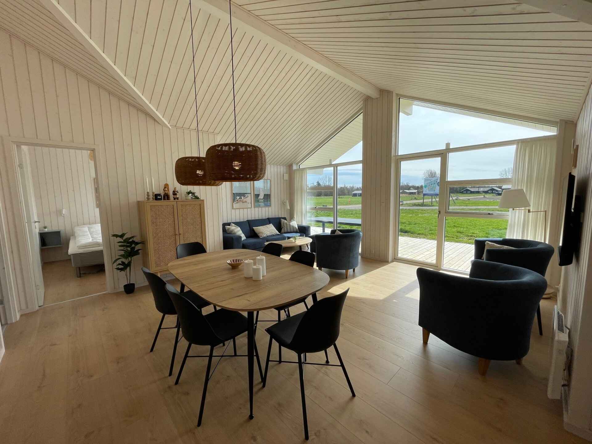 Stuen har varmepumpe, så komforten er sikret året rundt. Herfra er der åben forbindelse til spiseplads og køkken, som er praktisk indrettet til ferieliv.