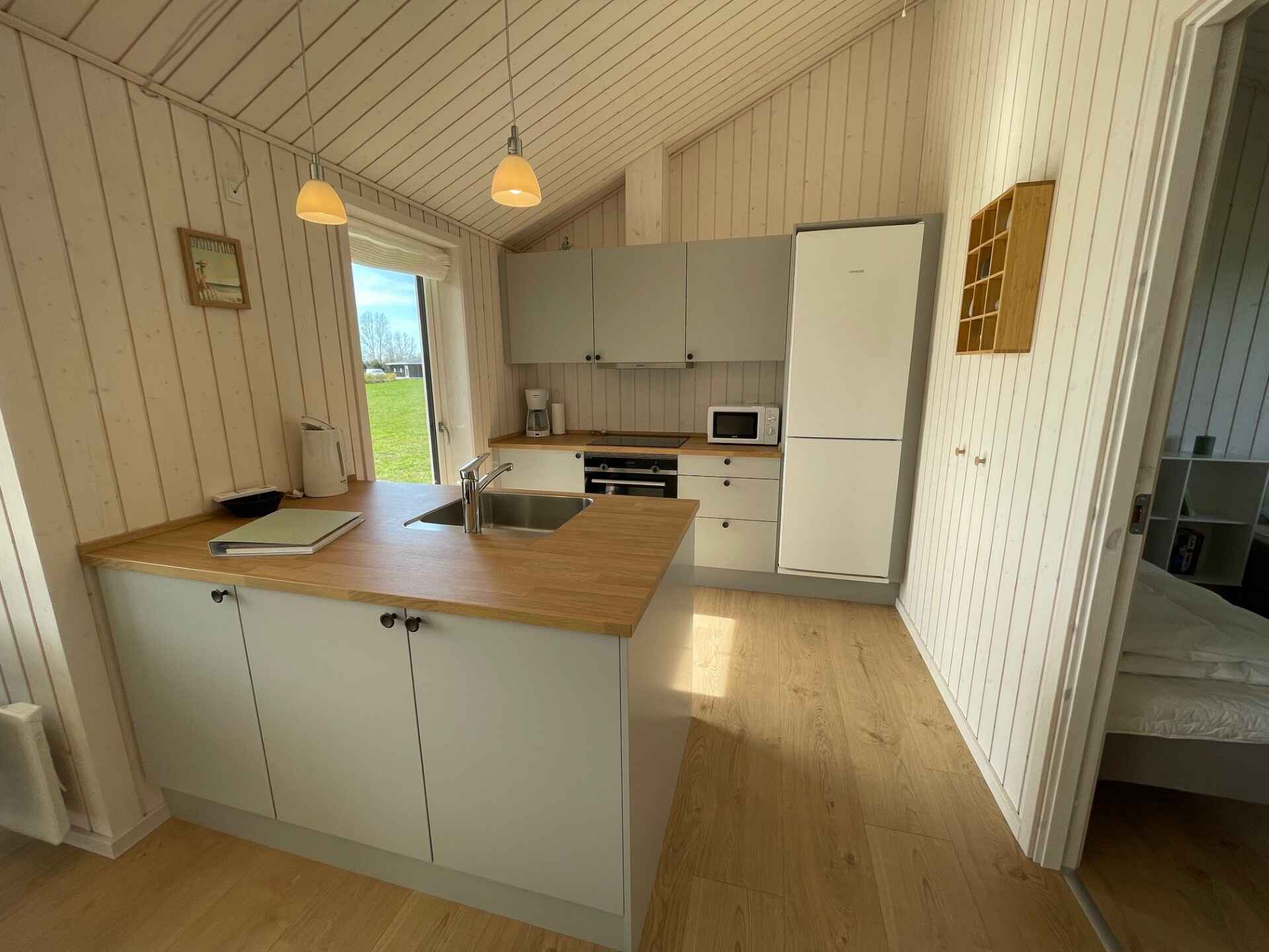 Stuen har varmepumpe, så komforten er sikret året rundt. Herfra er der åben forbindelse til spiseplads og køkken, som er praktisk indrettet til ferieliv.