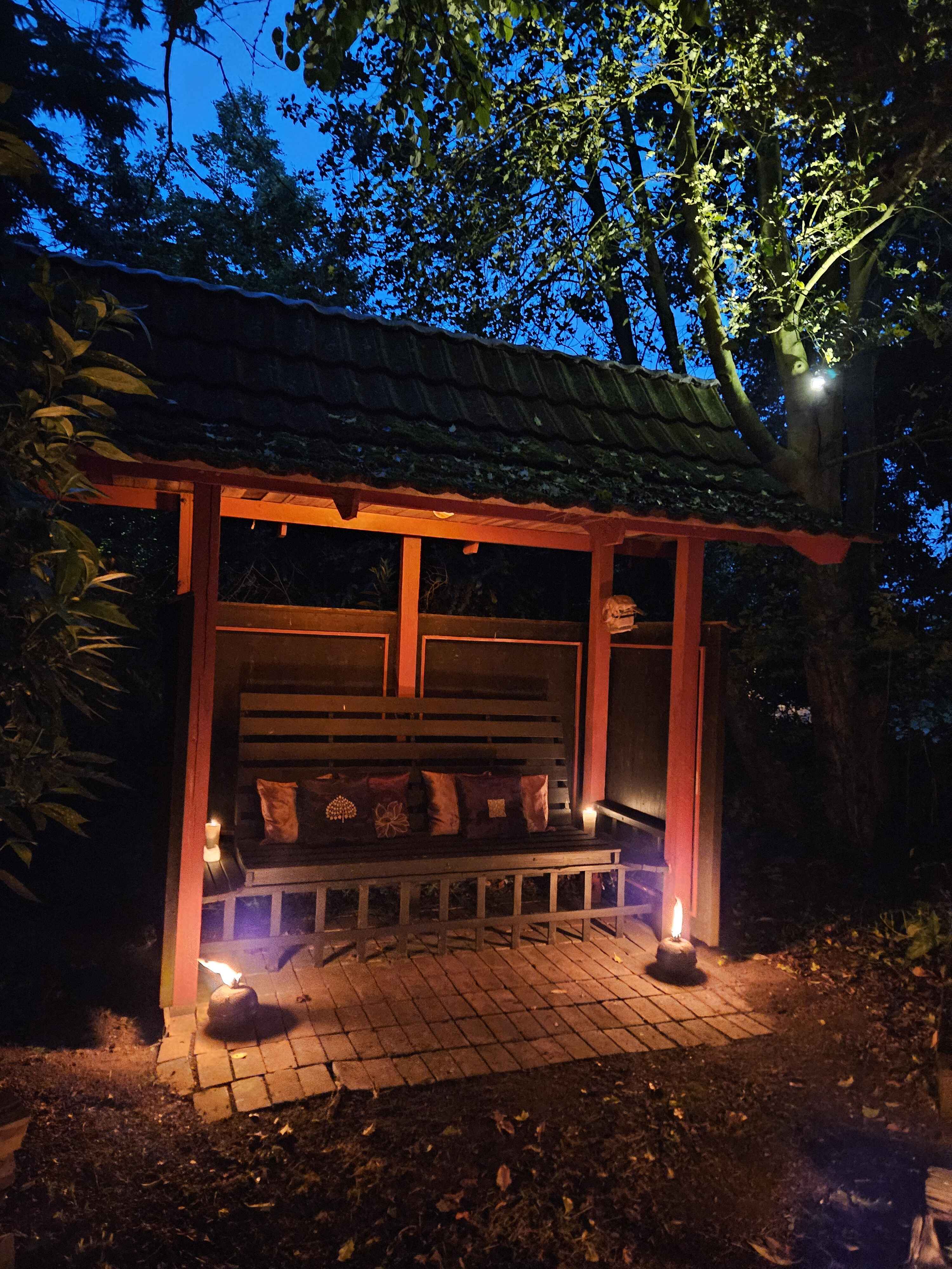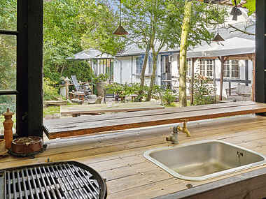 Udenfor finder I den store spændende have hvor børnene kan gå på eventyr i lysthuset i ’skoven’, og de voksne kan finde et ugeneret sted at nyde en kop kaffe. Der er også en dejlig terrasse, perfekt til grillmiddage. Der findes riste til på grill over bål, og der er også grill i udekøkkenet under overdække.