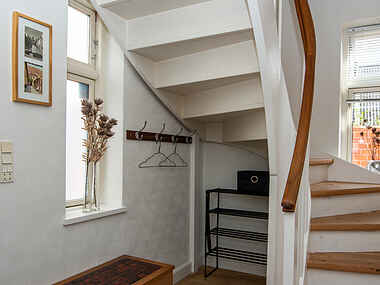 Entre med trappe til 1 sal. Stue med brændeovn. Spiseplads, Køkken med køleskab(m/ fryser), Baggang med udgang til gårdhaven. Badeværelse med toilet, håndvask og bruser.