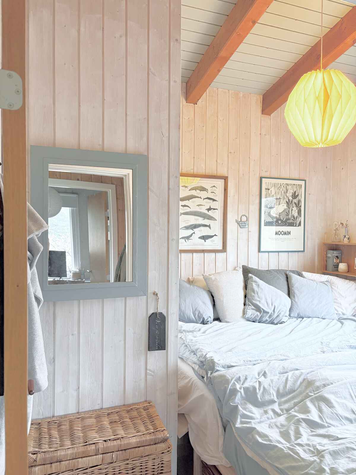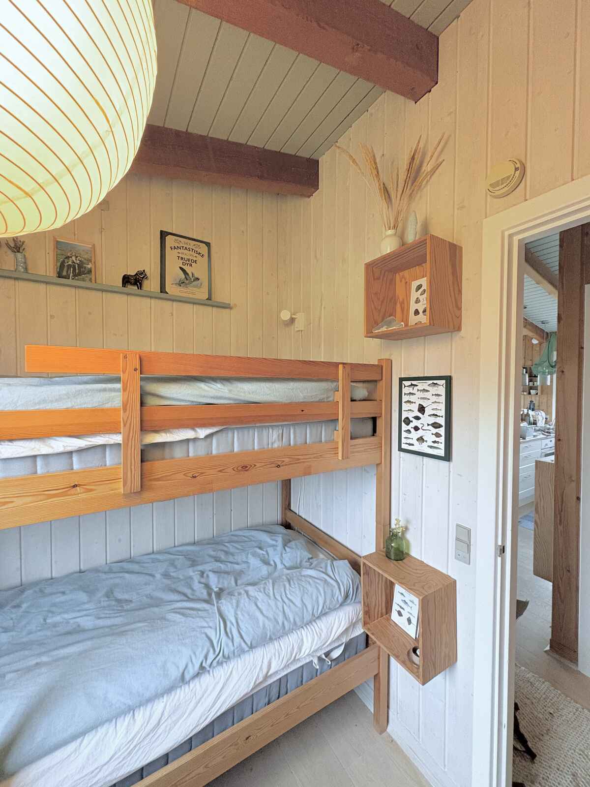 Sommerhuset er simpelt, funktionelt og har alt, hvad I som familie skal bruge for at komme helt ned i tempo. Hele husets omdrejningspunkt er det store, åbne køkken, som er i forlængelse af stuen. Der er højt til loftet, der kommer masser af lys ind, og så har det masser af 70’er charme, som netop er det årti, huset er fra. Fyrretræsplanker på væggene, store vinduer med direkte udsigt til havet, personlig indretning og plads til bare at være sammen som familie. I vil kunne mærke det med det samme. Den der helt særlige følelse af ægte sommerhusstemning.